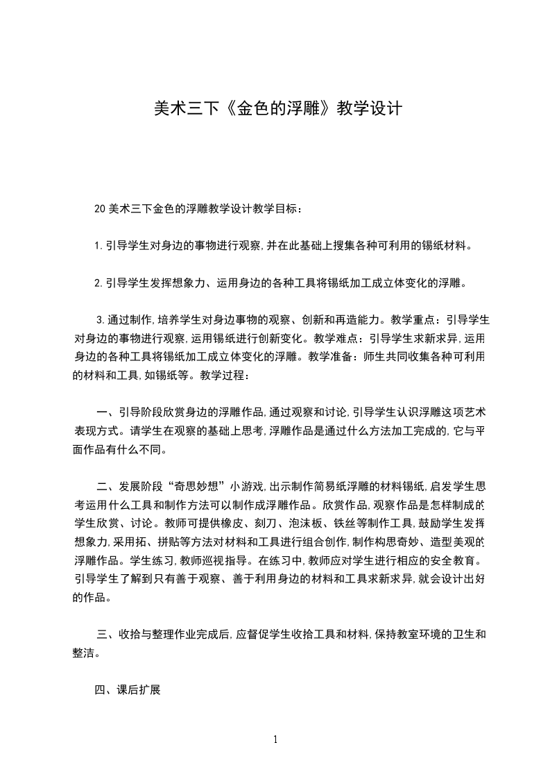 3.通过制作,培养学生对身边事物的观察、创新和再造能力。教学重点:引导学生对身边的事物进行观察,运用锡纸进行创新变化。教学难点:引导学生求新求异,运用身边的各种工具将锡纸加工成立体变化的浮雕。教学准备:师生共同收集各种可利用的材料和工具,如锡纸等。教学过程:
