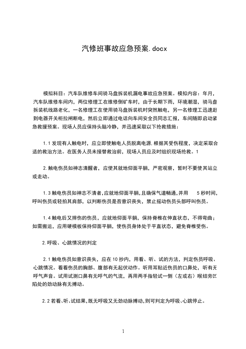 模拟科目:汽车队维修车间骑马盘拆装机漏电事故应急预案。模拟内容:年月,汽车队维修车间内,两位修理工在维修倒矿车时,由于长期下雨,环境潮湿,骑马盘拆装机线路老化,一名修理工在使用骑马盘拆装机时突然触电,另一名修理工迅速赶到电器开关柜拉闸断电,然后立即通过电话向车间安全员同志汇报,车间随即启动紧急救援预案。现场人员应保持头脑冷静,并迅速采取以下抢救措施: