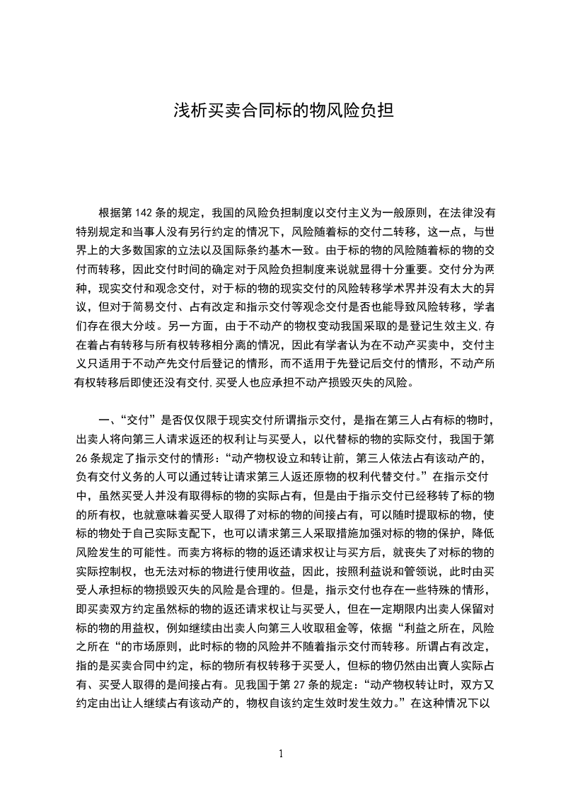 (2)交付的涵义:“交付”指买卖标的物的交付,即“占有的移转”。“交付”不等于“履行”,更不同于“清偿”。交付仅指标的物占有的移转,不包括其他履行合同义务的行为。因此,“履行”的范围宽于“交付”。“清偿”后买卖合同消灭,不存在风险负担的问题了。现实交付、简易交付、指示交付、占有改定都是交付方式,在风险移转上的功能相同。例5月1日,甲将一头牛出卖给乙,价款5千元。甲提出借用(租用也一样)该牛三个月,乙表示同意,6月1日,该牛遭雷击死亡。此例中:甲、乙没有约定风险负担的规则,自交付时起风险由乙承担。甲、乙于5月1日以占有改定的方式交付,因此风险自5月1日由乙承担。