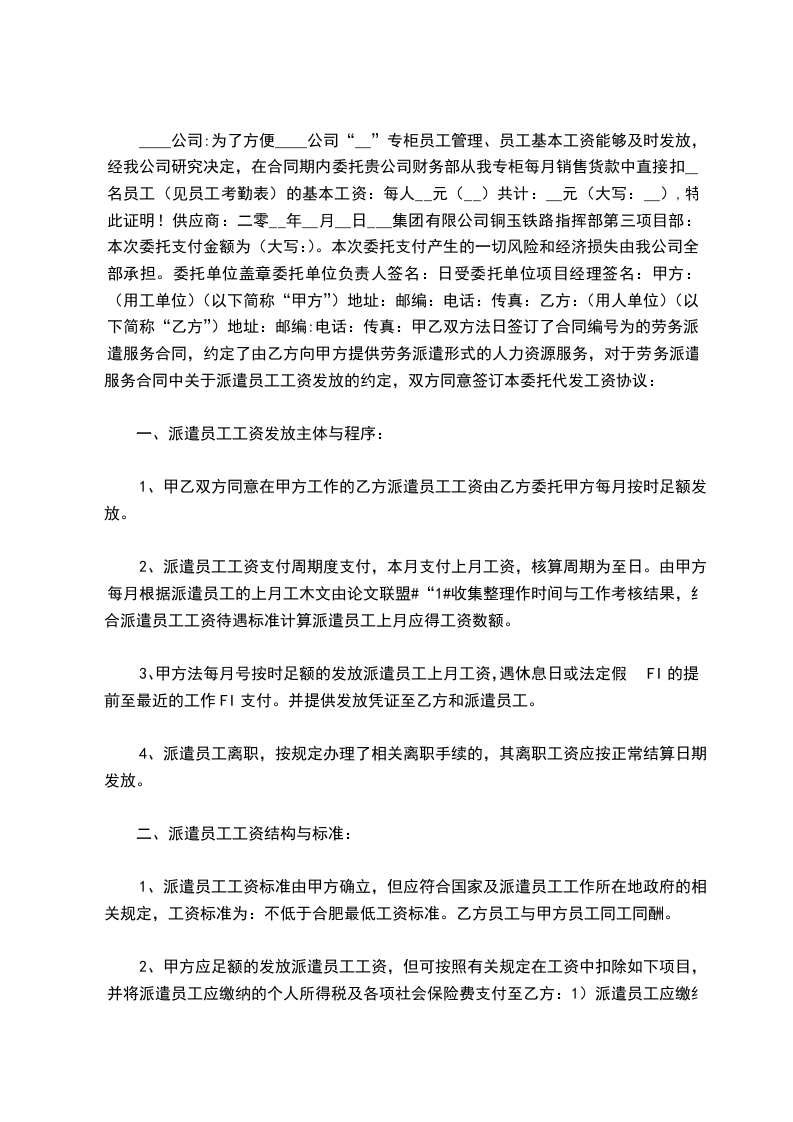 范文公司“”专柜员工管理、员工基本工资能够及时发放,经我公司研究决定,在合同期内委托贵公司财务部从我专柜每月销售货款中直接扣名员工(见员工考勤表)的基本工资:每人元共计:元(大写:),特此证明!供应商:二零年月日集团有限公司铜玉铁路指挥部第三项目部:本次委托支付金额为人民币元(大写:人民币元)。本次委托支付产生的一切风险和经济损失由我公司全部承担。委托单位盖章委托单位负责人签名:年月日受委托单位项目经理签名:甲方:(用工单位)(以下简称“甲方”)地址:邮编:电话:传真:乙方:(用人单位)(以下简称“乙方”)地址:邮编:电话:传真:甲乙双方于年月日签订了合同编号为的劳务派遣服务合同,约定了由乙方向甲方提供劳务派遣形式的人力资源服务,对于劳务派遣服务合同中关于派遣员工工资发放的约定,双方同意签订本委托代发工资协议: