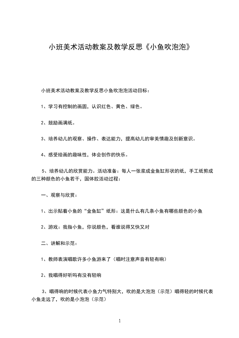 四、交流和分享:师:小鱼吹泡泡吹得可开心啦,我们一起来做游戏吧!唱许多小鱼游来了唱到“把它抓住”时任意蒙住纸上任意一条鱼,猜猜蒙住的是什么颜色的小鱼活动反思:在美术教学活动中,教师积极引导孩子看看、画画、玩玩,让幼儿在自由自在的天地中充分感受美,表现美。本次活动,我们主要是通过游戏活动的形式,让在幼儿生动,活泼的情境中玩吹泡泡的游戏,发现了泡泡的形状、大小和颜色,积极尝试用不同大小颜色的瓶盖印画泡泡,孩子们参与活动的兴趣很浓,达到“寓教于乐”的教学效果。这样,孩子学习的积极性调动起来了,使整个活动过程充满轻松、愉悦的气氛。活动结束时,让幼儿相互展示、分享,充分体现以幼儿为活动的主体,发挥了幼儿的主动性,参与性。