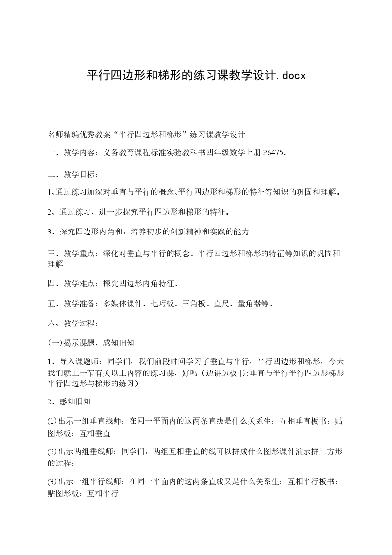名师精编优秀教案“平行四边形和梯形”练习课教学设计