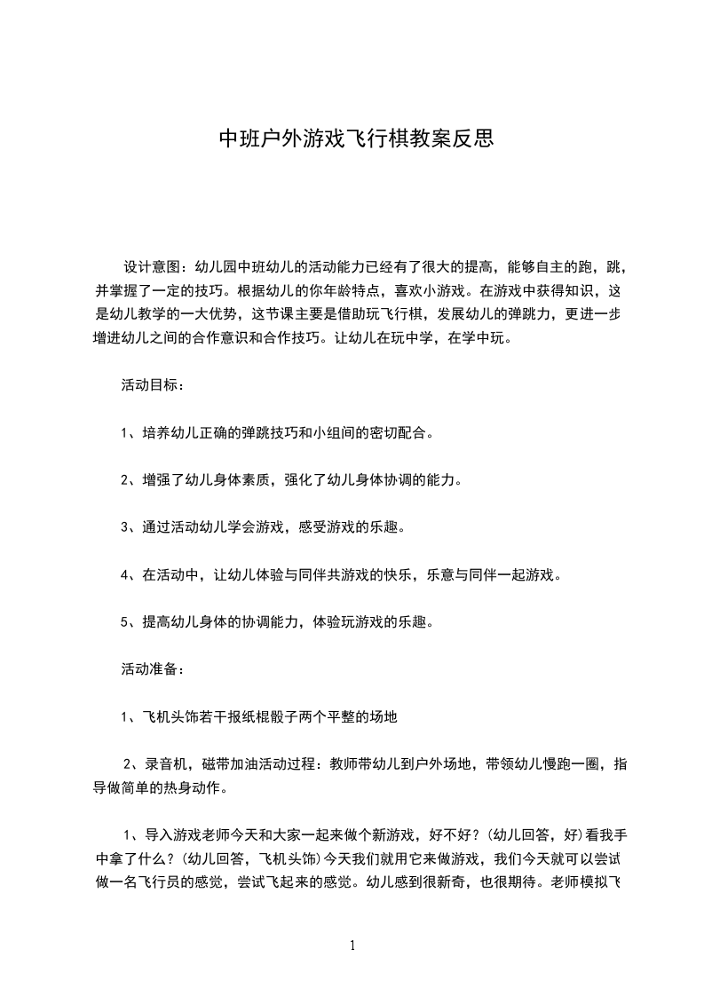 (9)中班户外游戏详案教案反思飞行棋设计意图:幼儿的活动能力已经有了很大的提高,能够自主的跑,跳,并掌握了一定的技巧。根据幼儿的你年龄特点,喜欢小游戏。在游戏中获得知识,这是幼儿教学的一大优势,这节课主要是借助玩飞行棋,发展幼儿的弹跳力,更进一步增进幼儿之间的合作意识和合作技巧。让幼儿在玩中学,在学中玩。活动目标: