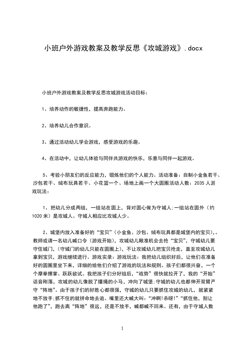 (11)中班游戏教案详案拔河含反思设计意图:中班的幼儿,自我保护能力还比较差,所以在户外活动器械制作方面,尽量选择环保的、不尖锐锋利的、没有危险性的材料。拔横绳这一活动主要是采用了绳子这一活动材料,没有危险性,比较适合适合中班的幼儿玩。而且,这个游戏活动不仅能锻炼幼儿的手臂的力量,更主要的是能很好的培养幼儿在活动中的合作能力,为以后的合作活动打下基础。活动目标: