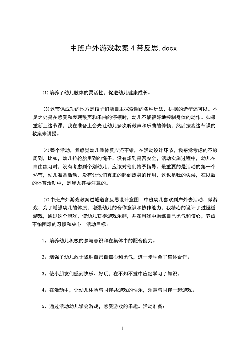 (7)中班户外游戏教案过隧道含反思设计意图:中班幼儿喜欢到户外去活动,做游戏,为了增强幼儿的体质,增强幼儿的合作意识和协作能力,我精心的设计了过隧道游戏,通过这个游戏,使幼儿获得游戏乐趣,并在游戏中磨练自己勇气和信心,养成不怕困难的习惯和决心。活动目标: