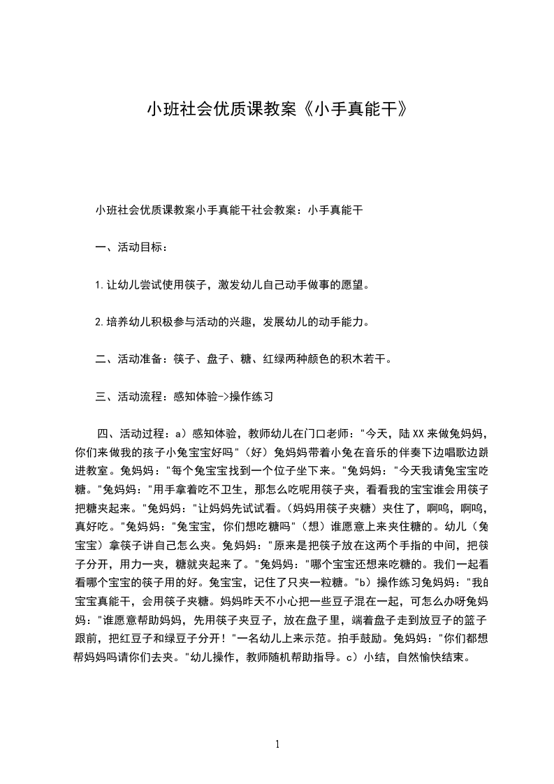 小班社会优质课教案小手真能干社会教案:小手真能干