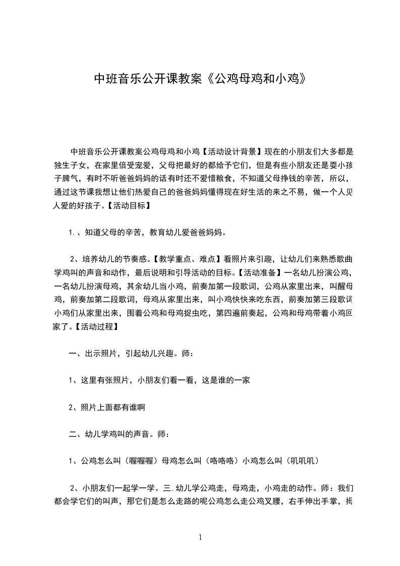 中班音乐公开课教案公鸡母鸡和小鸡【活动设计背景】现在的小朋友们大多都是独生子女,在家里倍受宠爱,父母把最好的都给予它们,但是有些小朋友还是耍小孩子脾气,有时不听爸爸妈妈的话有时还不爱惜粮食,不知道父母挣钱的辛苦,所以,通过这节课我想让他们热爱自己的爸爸妈妈懂得现在好生活的来之不易,做一个人见人爱的好孩子。【活动目标】