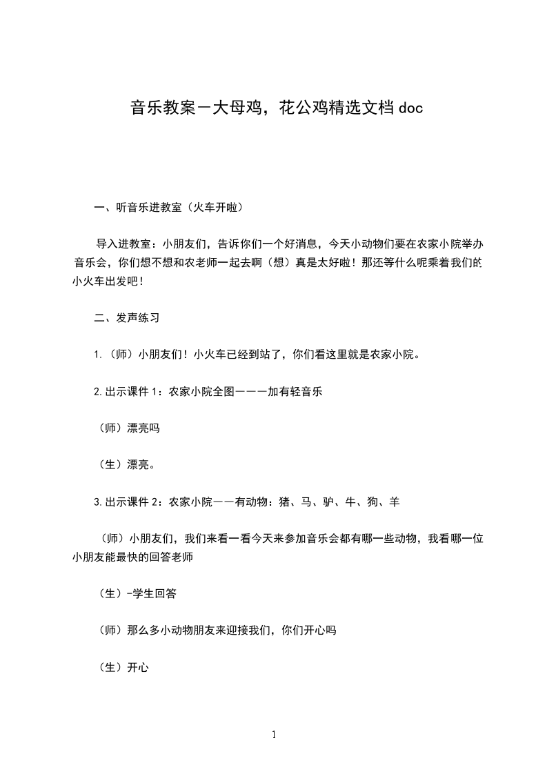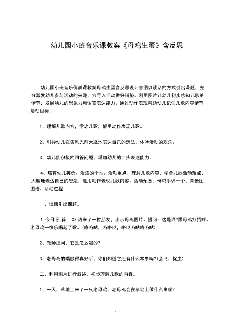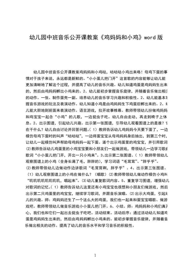2、培养幼儿的节奏感。【教学重点、难点】看照片来引趣,让幼儿们来熟悉歌曲学鸡叫的声音和动作,最后说明和引导活动的目标。【活动准备】一名幼儿扮演公鸡,一名幼儿扮演母鸡,其余幼儿当小鸡,前奏加第一段歌词,公鸡从家里出来,叫醒母鸡,前奏加第二段歌词,母鸡从家里出来,叫小鸡快快来吃东西,前奏加第三段歌词小鸡们从家里出来,围着公鸡和母鸡捉虫吃,第四遍前奏起,公鸡和母鸡带着小鸡回家了。【活动过程】