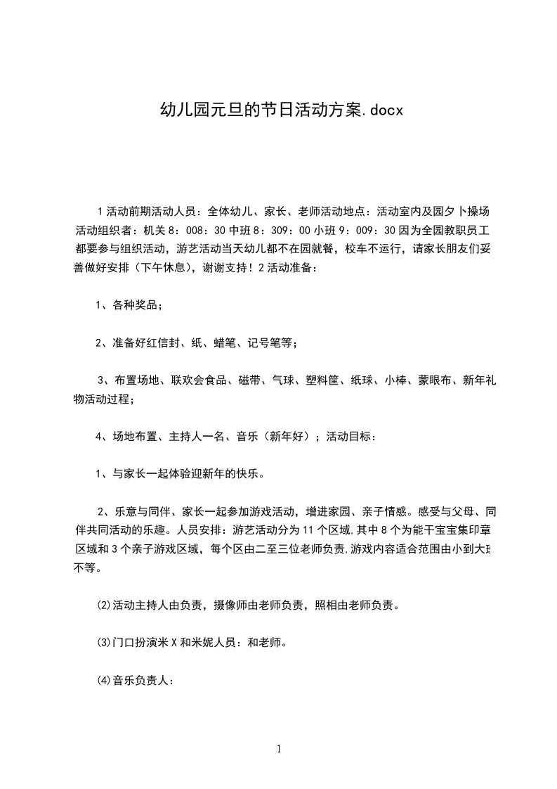 1活动前期活动人员:全体幼儿、家长、老师活动地点:活动室内及园夕卜操场活动组织者:机关8:008:30中班8:309:00小班9:009:30因为全园教职员工都要参与组织活动,游艺活动当天幼儿都不在园就餐,校车不运行,请家长朋友们妥善做好安排(下午休息),谢谢支持!2活动准备: