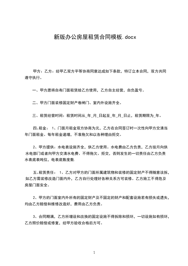 四、租金:1、门面月租金双方协商为元,乙方在合同签订时一次性向甲方交清当年门面租金。每年租金递增,不准拖欠和以各种理由拒交。