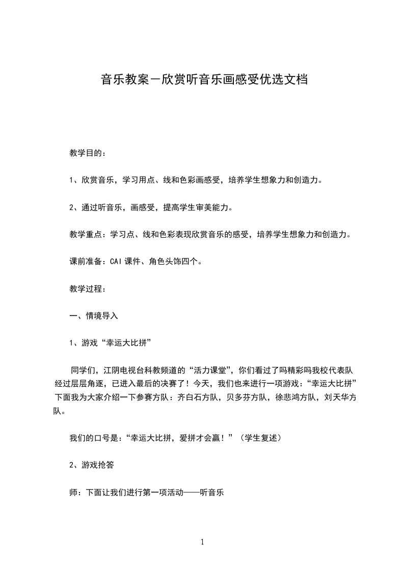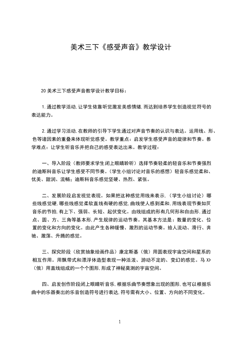 2.通过学习活动,在教师的引导下学生通过对声音节奏的认识与表达。运用线、形、色等诸因素的重叠来体现听觉感受。教学重点:启发学生感受声音的旋律和节奏。教学难点:让学生听音乐并把自己的感受表达出来。教学过程: