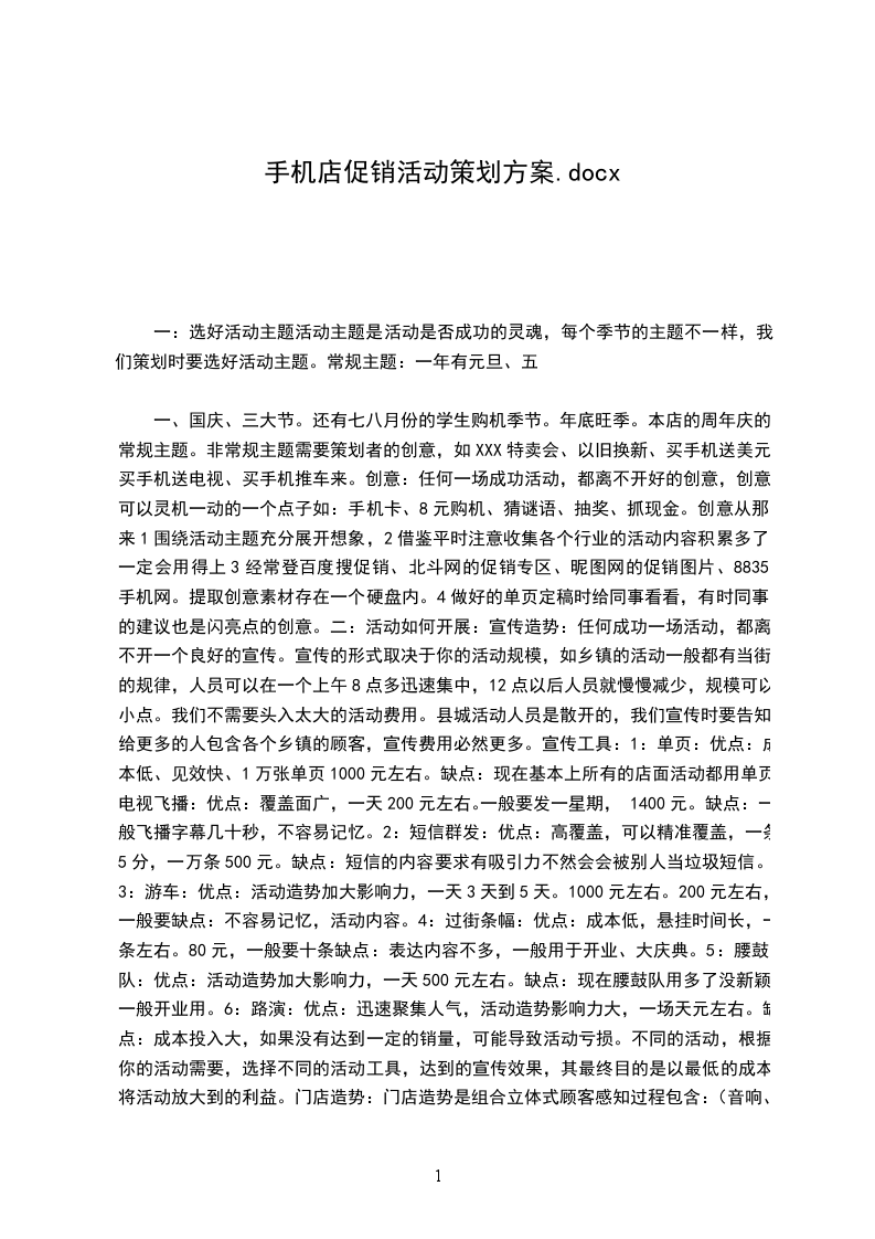 一、国庆、三大节。还有七八月份的学生购机季节。年底旺季。本店的周年庆的常规主题。非常规主题需要策划者的创意,如XXX特卖会、以旧换新、买手机送美元、买手机送电视、买手机推车来。创意:任何一场成功活动,都离不开好的创意,创意可以灵机一动的一个点子如:手机卡、8元购机、猜谜语、抽奖、抓现金。创意从那来1围绕活动主题充分展开想象,2借鉴平时注意收集各个行业的活动内容积累多了一定会用得上3经常登百度搜促销、北斗网的促销专区、昵图网的促销图片、8835手机网。提取创意素材存在一个硬盘内。4做好的单页定稿时给同事看看,有时同事的建议也是闪亮点的创意。二:活动如何开展:宣传造势:任何成功一场活动,都离不开一个良好的宣传。宣传的形式取决于你的活动规模,如乡镇的活动一般都有当街的规律,人员可以在一个上午8点多迅速集中,12点以后人员就慢慢减少,规模可以小点。我们不需要头入太大的活动费用。县城活动人员是散开的,我们宣传时要告知给更多的人包含各个乡镇的顾客,宣传费用必然更多。宣传工具:1:单页:优点:成本低、见效快、1万张单页1000元左右。缺点:现在基本上所有的店面活动都用单页电视飞播:优点:覆盖面广,一天200元左右。一般要发一星期,1400元。缺点:一般飞播字幕几十秒,不容易记忆。2:短信群发:优点:高覆盖,可以精准覆盖,一条5分,一万条500元。缺点:短信的内容要求有吸引力不然会会被别人当垃圾短信。3:游车:优点:活动造势加大影响力,一天3天到5天。1000元左右。200元左右,一般要缺点:不容易记忆,活动内容。4:过街条幅:优点:成本低,悬挂时间长,一条左右。80元,一般要十条缺点:表达内容不多,一般用于开业、大庆典。5:腰鼓队:优点:活动造势加大影响力,一天500元左右。缺点:现在腰鼓队用多了没新颖,一般开业用。6:路演:优点:迅速聚集人气,活动造势影响力大,一场天元左右。缺点:成本投入大,如果没有达到一定的销量,可能导致活动亏损。不同的活动,根据你的活动需要,选择不同的活动工具,达到的宣传效果,其最终目的是以最低的成本将活动放大到的利益。门店造势:门店造势是组合立体式顾客感知过程包含:(音响、视觉、服务、人气组合起的一种氛围。)门店造势工具:音响:活动要保证有一个良好的音响效果,如果你在搞活动,对面同行比你的音响还大,完全压制了你的音响,可以想象的活动效果是不可能有好的业绩。彩虹门:如果不是自己常用的彩虹门,一定要提前检查彩虹门是否有用,鼓风机是否正常。店内:门头条幅、气球门、地帖、橱窗、墙壁、吊排、的主题色调是否突出一致。店员:服饰统