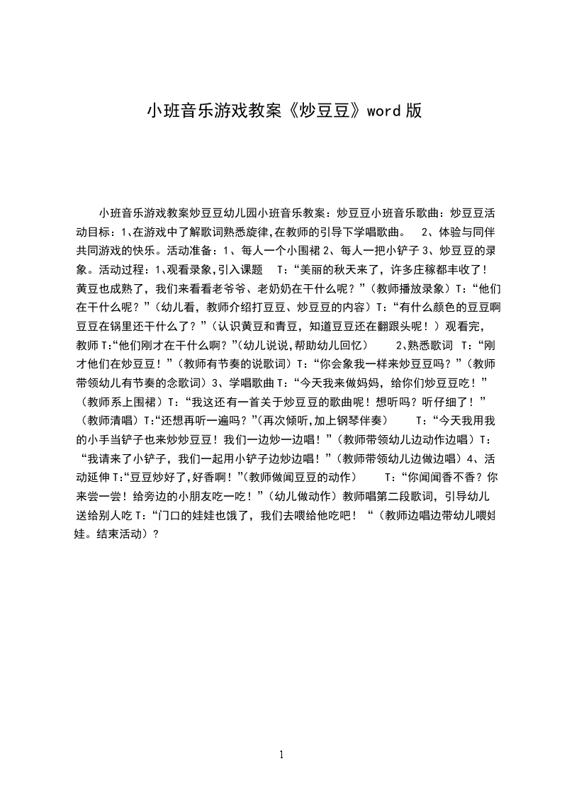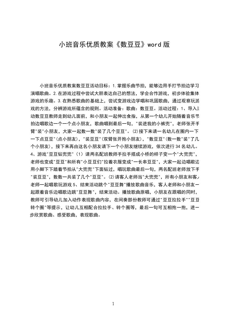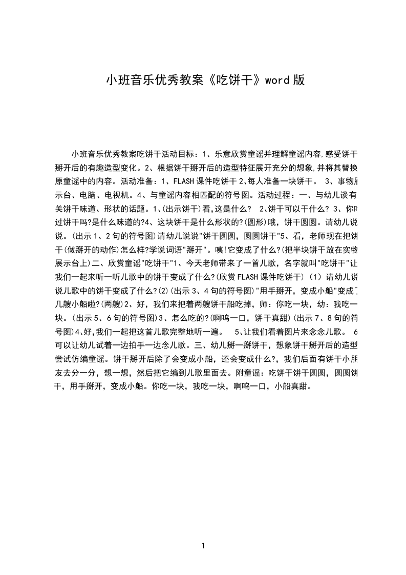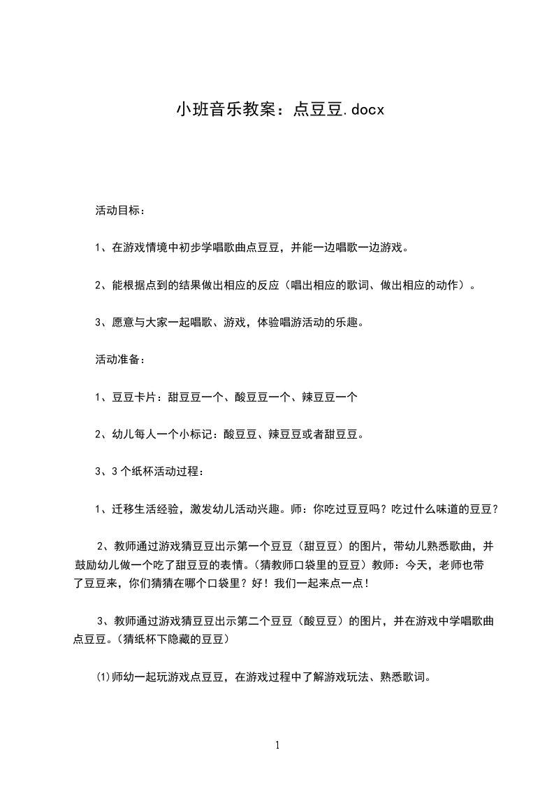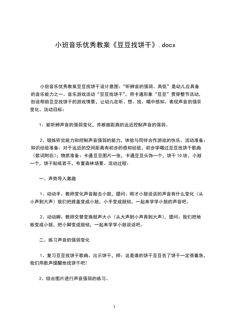 小班音乐优秀教案豆豆找饼干设计意图:“听辨音的强弱、高低”是幼儿应具备的音乐能力之一。音乐游戏活动“豆豆找饼干”,用卡通形象“豆豆”贯穿整节活动,创设帮助豆豆找饼干的游戏情景,让幼儿在听、想、找、唱中感知、表现声音的强弱变化。活动目标: