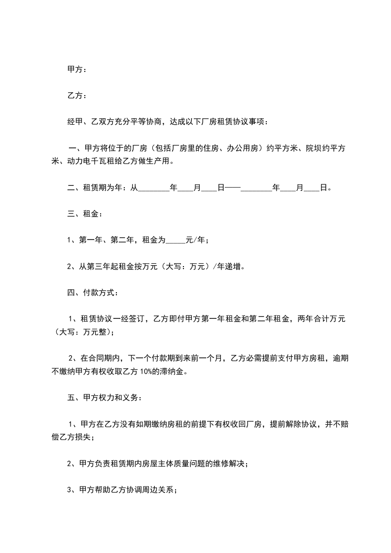 经甲、乙双方充分平等协商,达成以下厂房租赁协议事项: