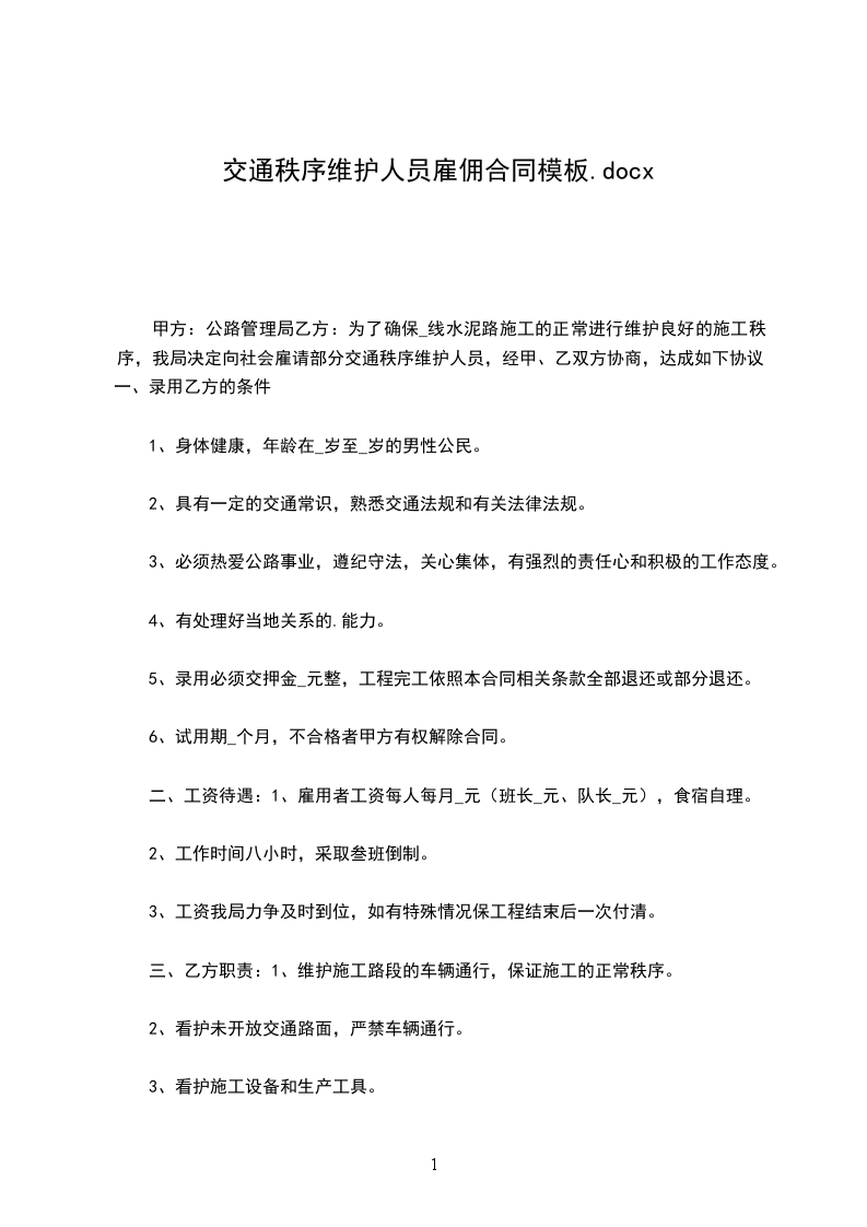 甲方:公路管理局乙方:为了确保_线水泥路施工的正常进行维护良好的施工秩序,我局决定向社会雇请部分交通秩序维护人员,经甲、乙双方协商,达成如下协议:一、录用乙方的条件