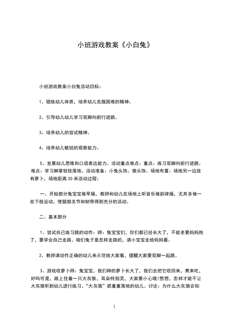 小班语言游戏教案小白兔与小XX设计思路:现在的幼儿,由于成人的过度宠爱,导致他们极度以自我为中心。表现在日常生活中,如常常为一件玩具或很小的一件事而吵闹。小白兔和小XX的内容正好体现了好朋友之间分享、相互帮助、相互关心的情感,既有利于幼儿的情感培养,又符合正在开展的“好朋友”的主题活动。小白兔和小XX简单的情节也较适宜小班幼儿阅读理解。在设计活动的过程中,我根据幼儿的同伴交往情况对原教材进行了改编。如在看卡通片的时候,一旦遇到低沉的音乐或者惊险的画面,胆小的幼儿就会立刻跑过来告诉我他害怕。这时候,几个大年龄的幼儿就会说:“不要怕,不要怕,我来保护你。”可见,幼儿已经有了初步关心同伴的意识。因此,我就新增加了小白兔害怕闪电打雷,小XX安慰它的情节。由于小班幼儿注意力保持时间很短,我在活动中运用了多媒体辅助教学,还添加了音乐背景,如小兔子一起拔萝卜时候的音乐、小兔子吃萝卜时候的欢快音乐、突然出现的打雷声、太阳升起时的音乐等,以充分调动幼儿的感官,并为幼儿的情感体验提供有利的帮助。为了让幼儿获得更深的情感体验,在帮助小XX一起拔萝卜的环节,我设计了两次角色扮演活动,调动幼儿的积极性,使他们参与到活动中,充分体验故事要表达的情感。活动目标: