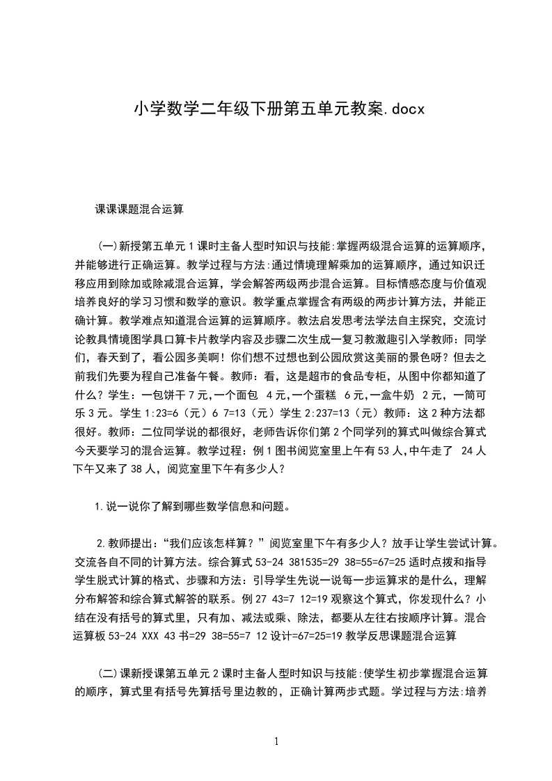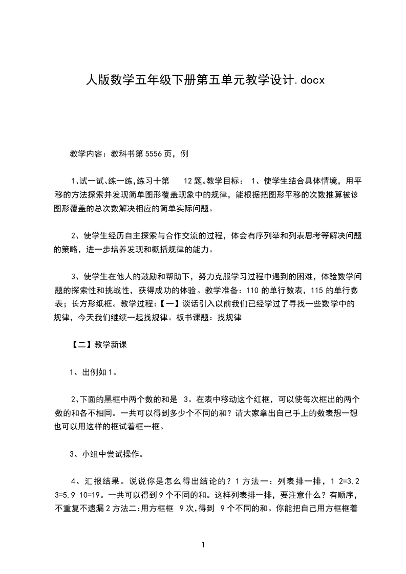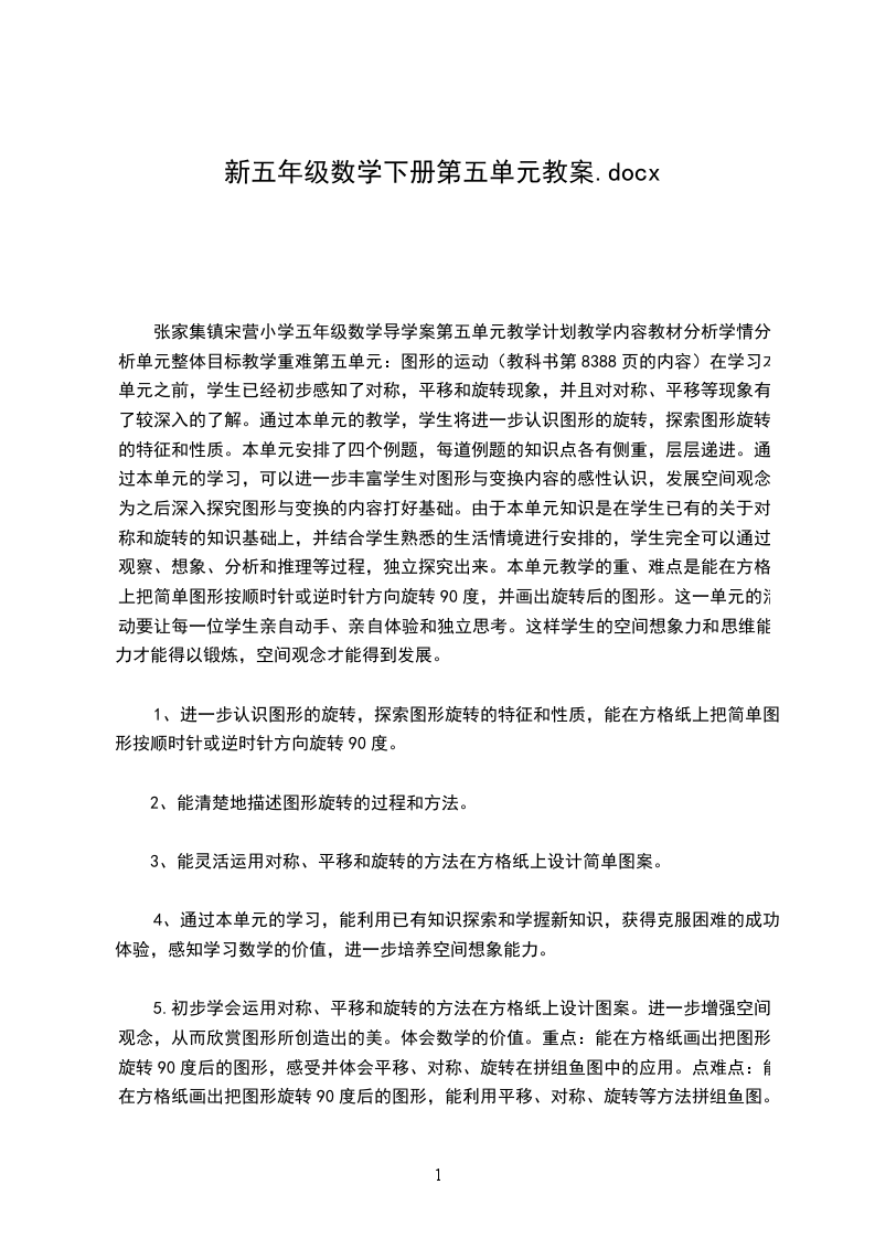 张家集镇宋营小学五年级数学导学案第五单元教学计划教学内容教材分析学情分析单元整体目标教学重难第五单元:图形的运动(教科书第8388页的内容)在学习本单元之前,学生已经初步感知了对称,平移和旋转现象,并且对对称、平移等现象有了较深入的了解。通过本单元的教学,学生将进一步认识图形的旋转,探索图形旋转的特征和性质。本单元安排了四个例题,每道例题的知识点各有侧重,层层递进。通过本单元的学习,可以进一步丰富学生对图形与变换内容的感性认识,发展空间观念,为之后深入探究图形与变换的内容打好基础。由于本单元知识是在学生已有的关于对称和旋转的知识基础上,并结合学生熟悉的生活情境进行安排的,学生完全可以通过观察、想象、分析和推理等过程,独立探究出来。本单元教学的重、难点是能在方格上把简单图形按顺时针或逆时针方向旋转90度,并画出旋转后的图形。这一单元的活动要让每一位学生亲自动手、亲自体验和独立思考。这样学生的空间想象力和思维能力才能得以锻炼,空间观念才能得到发展。