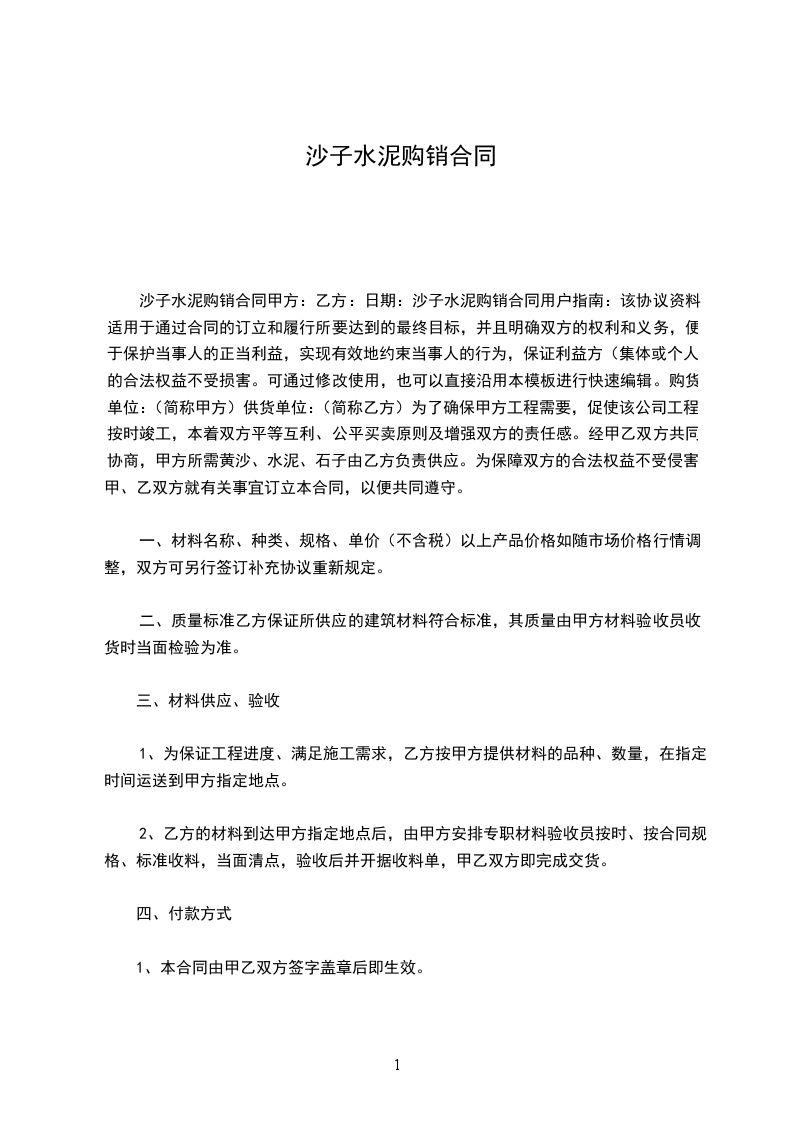 沙子水泥购销合同甲方:乙方:日期:沙子水泥购销合同用户指南:该协议资料适用于通过合同的订立和履行所要达到的最终目标,并且明确双方的权利和义务,便于保护当事人的正当利益,实现有效地约束当事人的行为,保证利益方(集体或个人)的合法权益不受损害。可通过修改使用,也可以直接沿用本模板进行快速编辑。购货单位:(简称甲方)供货单位:(简称乙方)为了确保甲方工程需要,促使该公司工程按时竣工,本着双方平等互利、公平买卖原则及增强双方的责任感。经甲乙双方共同协商,甲方所需黄沙、水泥、石子由乙方负责供应。为保障双方的合法权益不受侵害。甲、乙双方就有关事宜订立本合同,以便共同遵守。