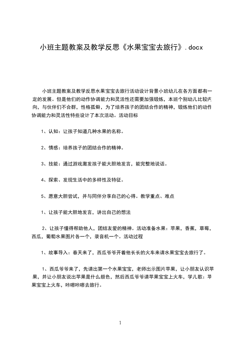 小班主题教案及教学反思水果宝宝去旅行活动设计背景小班幼儿在各方面都有一定的发展。但是他们的动作协调能力和灵活性还需要加强锻炼,本班个别幼儿比较内向,与伙伴们不合群,性格孤僻,为了培养孩子的团结合作的精神,锻炼他们的动作协调能力和灵活性特些设计了本次活动。活动目标
