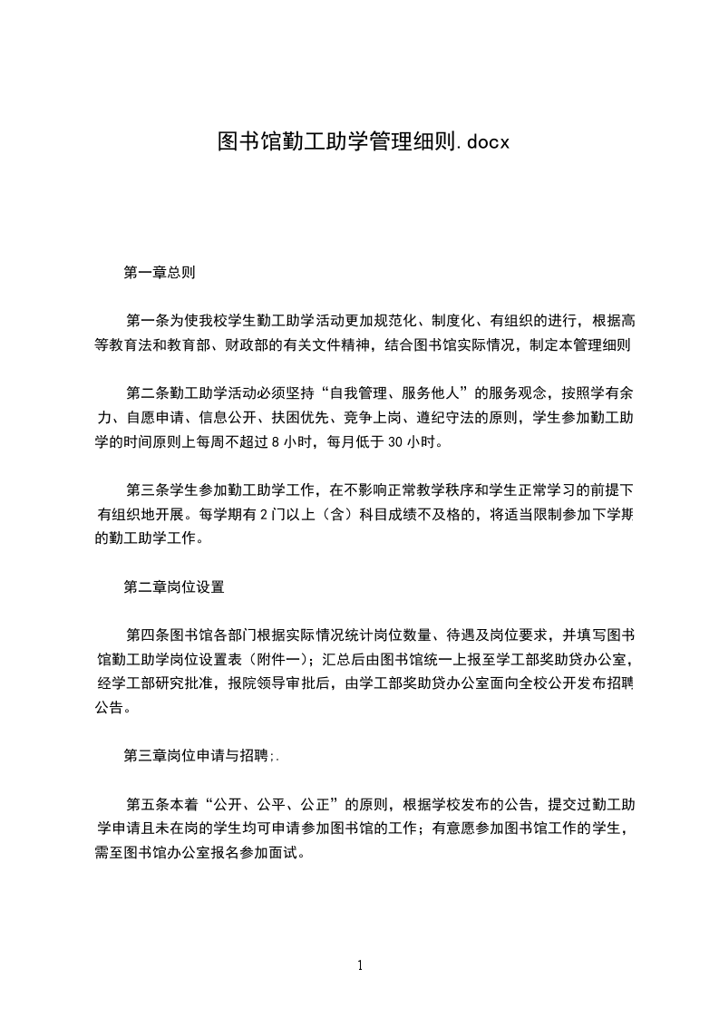 第一条为使我校学生勤工助学活动更加规范化、制度化、有组织的进行,根据高等教育法和教育部、财政部的有关文件精神,结合图书馆实际情况,制定本管理细则。