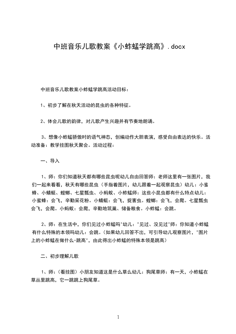 1、师:老师把刚刚的故事改编成了一首儿歌,我们一起来学一学这首儿歌吧。儿歌的名字叫小蚱蜢学跳高小蚱蜢,学跳高,一跳跳上狗尾草。腿一弹,脚一翘,哪个有我跳得高,草一溜,摔一跤,头上跌个大青包。(幼儿逐句跟教师学儿歌)