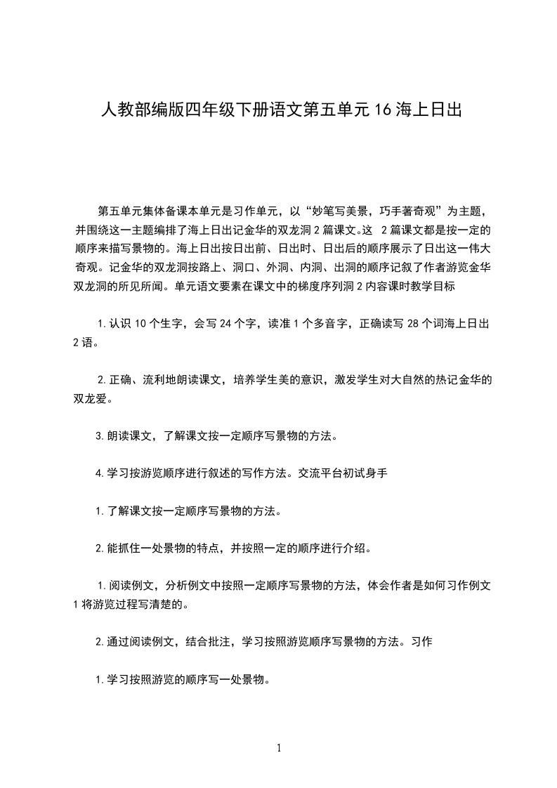 第五单元集体备课本单元是习作单元,以“妙笔写美景,巧手著奇观”为主题,并围绕这一主题编排了海上日出记金华的双龙洞2篇课文。这2篇课文都是按一定的顺序来描写景物的。海上日出按日出前、日出时、日出后的顺序展示了日出这一伟大奇观。记金华的双龙洞按路上、洞口、外洞、内洞、出洞的顺序记叙了作者游览金华双龙洞的所见所闻。单元语文要素在课文中的梯度序列洞2内容课时教学目标
