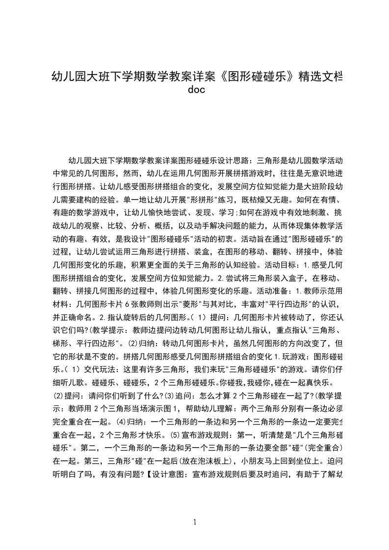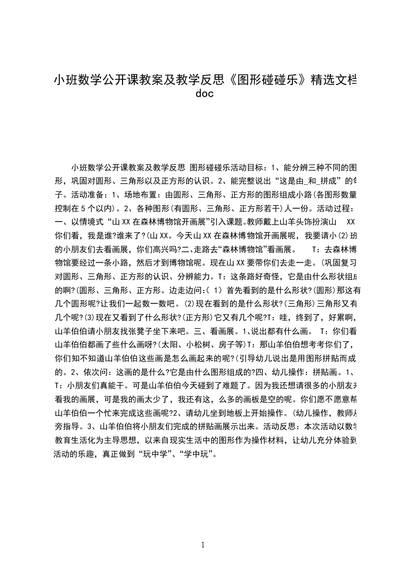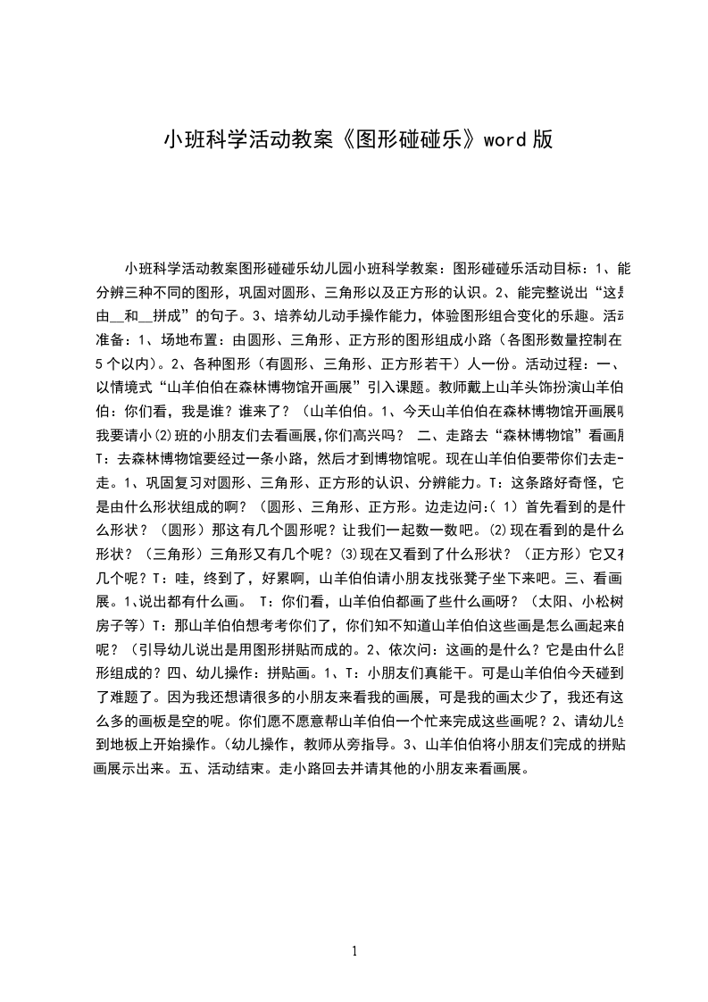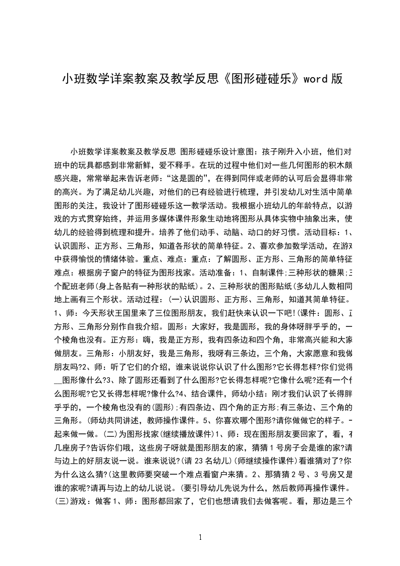 小班数学详案教案及教学反思图形碰碰乐设计意图:孩子刚升入小班,他们对班中的玩具都感到非常新鲜,爱不释手。在玩的过程中他们对一些几何图形的积木颇感兴趣,常常举起来告诉老师:“这是圆的”,在得到同伴或老师的认可后会显得非常的高兴。为了满足幼儿兴趣,对他们的已有经验进行梳理,并引发幼儿对生活中简单图形的关注,我设计了图形碰碰乐这一教学活动。我根据小班幼儿的年龄特点,以游戏的方式贯穿始终,并运用多媒体课件形象生动地将图形从具体实物中抽象出来,使幼儿的经验得到梳理和提升。培养了他们动手、动脑、动口的好习惯。活动目标: