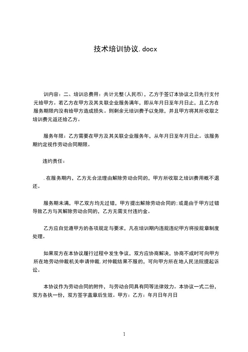 甲方:(单位)乙方:(培训人员)风险提示:注意慎重选择培训对象,不对试用期内的员工进行委外出资培训,因为,按法律规定,即使与其签订了服务期协议,试用期员工一旦辞职,企业是不能追究其赔偿违约金的。若该新员工表现优秀,确实要出资对其进行委外培训的,建议先给予办理提前转正,将其转为正式员工后再与其签订服务期协议,这样追究其违约责任时才合法。甲方根据公司发展需要,安排乙方进行电工培训,依据劳动法等有关法律规定,甲乙双方在平等互惠、协商一致的基础上达成如下条款:第一条培训情况培训时间:自_年_月_日至_年_月_日,共_天。培训内容:培训地点:第二条培训费用