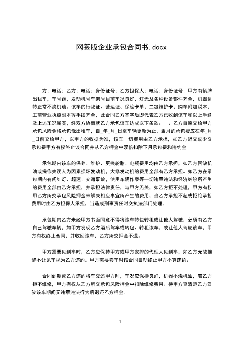 甲方:杭州公司乙方:汽车承包经营者经双方平等协商,协议如下:1、甲方将浙江a-号牌,荷载吨(座)货客运汽车承包给乙方,期限自年月至年月止。