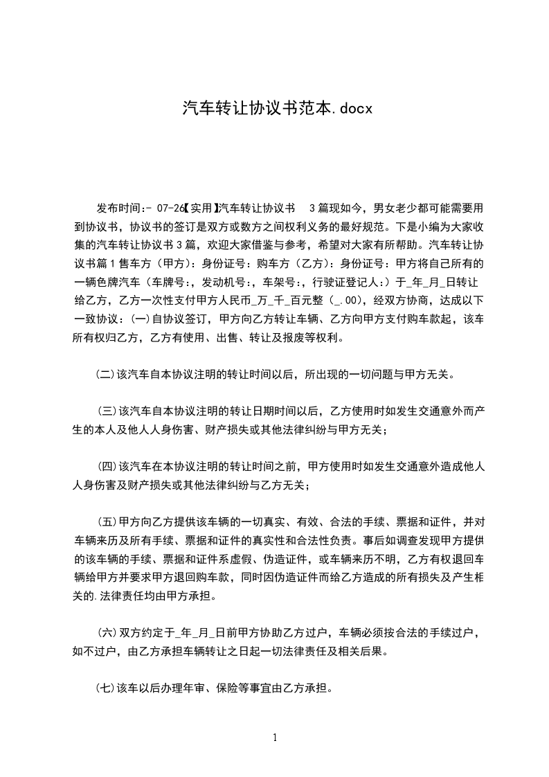 发布时间:-07-26【实用】汽车转让协议书3篇现如今,男女老少都可能需要用到协议书,协议书的签订是双方或数方之间权利义务的最好规范。下是小编为大家收集的汽车转让协议书3篇,欢迎大家借鉴与参考,希望对大家有所帮助。汽车转让协议书篇1售车方(甲方):身份证号:购车方(乙方):身份证号:甲方将自己所有的一辆色牌汽车(车牌号:,发动机号:,车架号:,行驶证登记人:)于_年_月_日转让给乙方,乙方一次性支付甲方人民币_万_千_百元整(_.00),经双方协商,达成以下一致协议:(一)自协议签订,甲方向乙方转让车辆、乙方向甲方支付购车款起,该车所有权归乙方,乙方有使用、出售、转让及报废等权利。