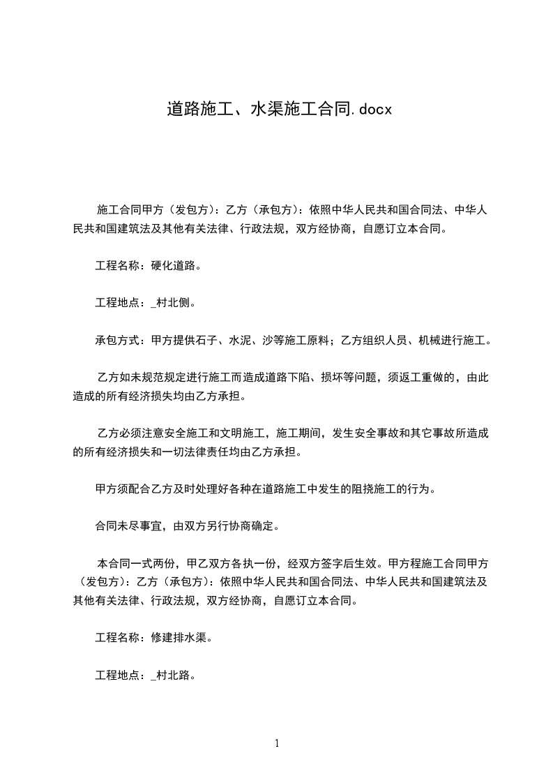 施工合同甲方(发包方):乙方(承包方):依照中华人民共和国合同法、中华人民共和国建筑法及其他有关法律、行政法规,双方经协商,自愿订立本合同。