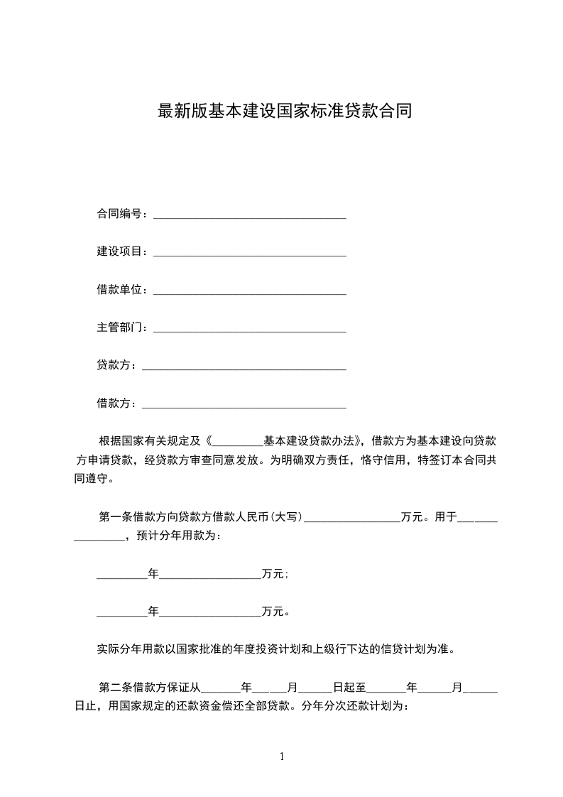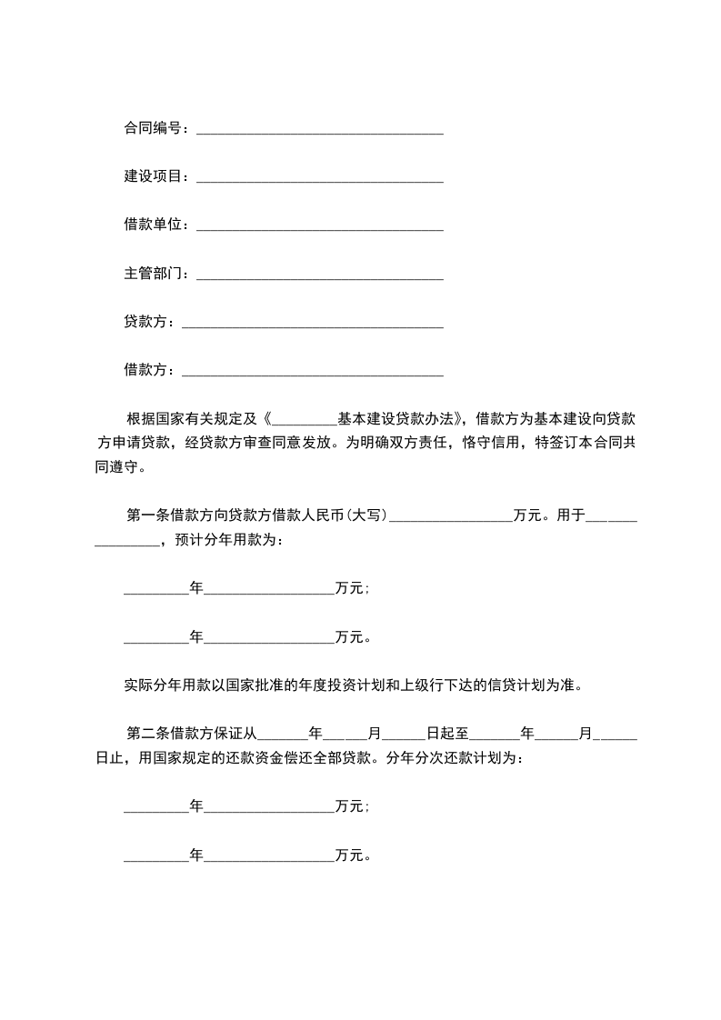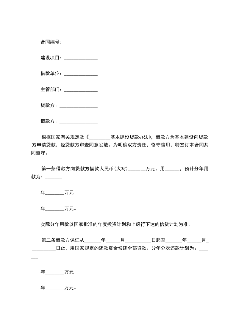 根据国家有关规定及《_________基本建设贷款办法》,借款方为基本建设向贷款方申请贷款,经贷款方审查同意发放。为明确双方责任,恪守信用,特签订本合同共同遵守。