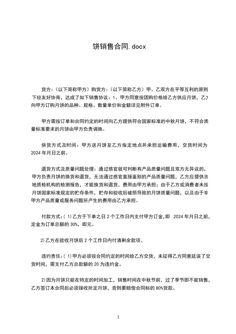 2)因为月饼只能在特定的时间加工,销售时间在中秋节前,过了季节即不能销售,乙方签订本合同后必须接收所定月饼,否则要赔偿合同标的80%货款。