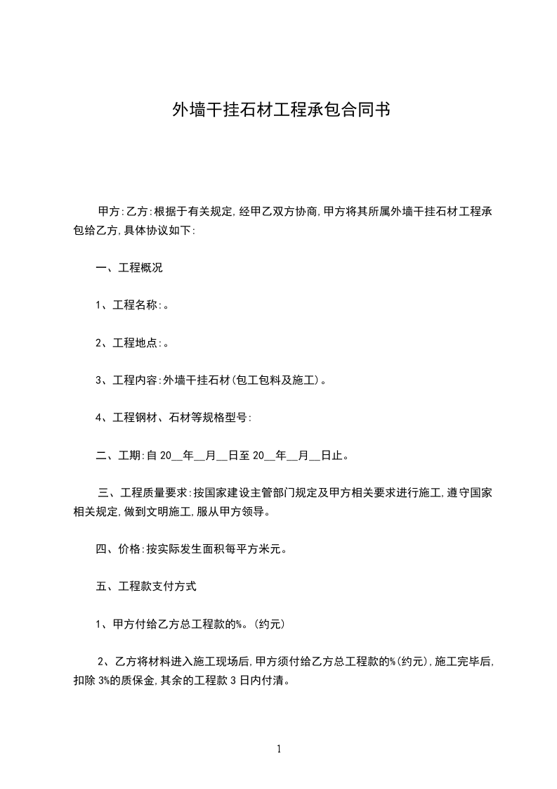 包人:福建XX公司(简称甲方)承包人:安装队伍(简称乙方)甲乙双方本着平等互利的原则签订外墙石材幕墙安装分包工程,经协商一致,达成协议,共同遵守下列条款:一、工程概况:1、工程名称:2、工程地点:3、承包面积:(以安装实际面积结算)