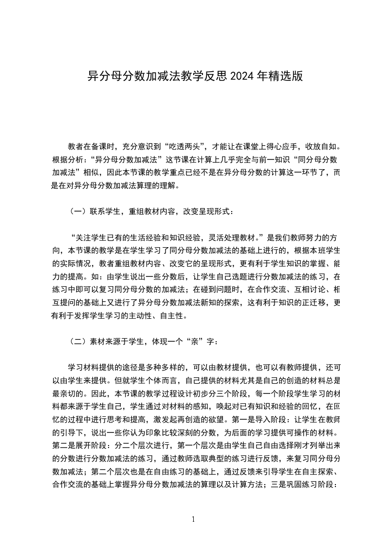 本课中,通过创设问题情境,引导学生自主探索发现异分母分数加减法的计算方法,理解算理,并在数感的培养、学习方法与策略、数学文化的渗透等方面下足功夫,促进学生的全面发展。