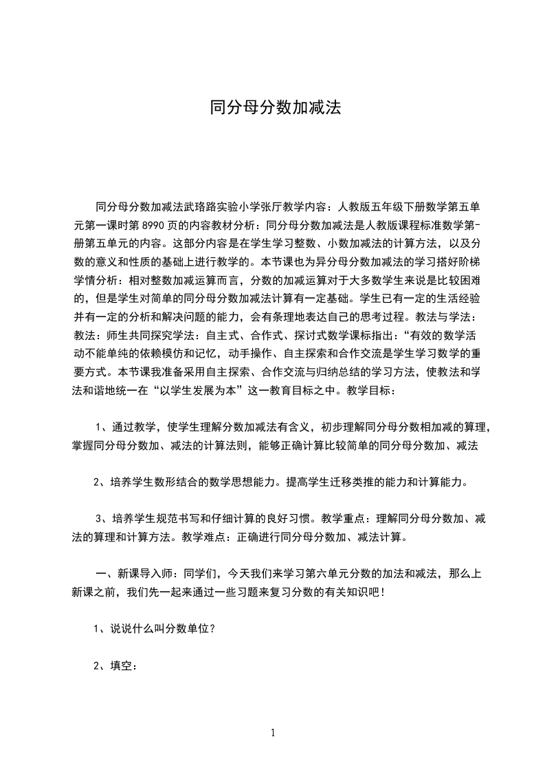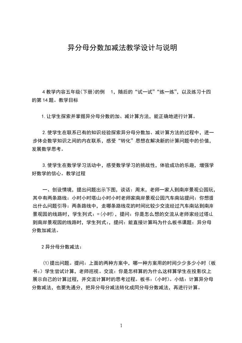 一、创设情境,提出问题出示下图,谈话:周末,老师一家人到南岸景观公园玩,其中有两条路线:小时小时塔山小时小时老师家南岸景观公园汽车南站提问:你想提出什么问题引导:两条路线中,走哪条路线花的时间比较少交流经过汽车南站到南岸景观园的线路时,学生列式:=(小时),提问:你是怎么想的交流从老师家经过塔山到南岸景观园的线路时,学生列式:,提问:能直接计算吗为什么板书课题:异分母分数加减法。