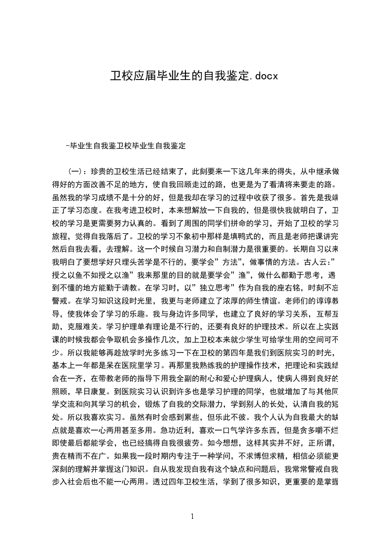 (二):本人自入学以来,一向遵守学校的各项规章制度,良好的思想道德品质,是我在各方面表现优秀。有强烈的群众荣誉感,和工作职责心,坚持实事求是的原则。在校期间本人一向勤奋学习,刻苦专研,透过系统的学习掌握较为扎实的基础知识。由于良好的学习作风和明确的学习目标,在课余时光用心参加学校开展的各项活动参加社会实践丰富了课余生活。是自我在各方面得到了相应的提高,锻炼出了吃苦耐劳,工作认真求学上进理解潜力强有较强的团队合作精神较强的社会适应潜力的得到了充分的体现。。我始终都是以用心的信念和勤奋的态度,对于护理工作满腔热情,将耐心、细心、热心、职责心贯穿于整个护理工作,在业务方面认真专研,不断的加强业务学习,把学到的新理论新观念及时的运用到护理工作的具体实践中,真正做到以病人为中心,以质量为核心的服务宗旨,工作尽职尽责、踏踏实实。练就了扎实的基本功,成为了科室的护理骨干。护理工作得到了老师的好评和认可。实习的过程中让我收获颇多,让我从生命里爱上“白衣天使”这一神圣的使命。使我对医学理论知识有了进一步的提高,实事求是精益求精热爱医学事业的我立志献身于医学事业!我决心全力以赴解除病人之病痛使之有一个完美的健康,救死扶伤不辞艰辛,执着追求,为了祖国为西部医学卫生事业的发展奋斗终身尽我微薄的力量我将在以后的工作学习中更加努力不断充实自我完善自我做一名合格的医务人员。本人在校期间热爱祖国,热爱医学事业。在厚德博学,精益求精八字校训的鞭策下,我努力的学习,刻苦专研,勇于进取努力将自我培养成为具有较高综合素质的医学毕业生。尊敬老师团结同学用心完成学校交给的各项任务在临床实习期间用心向临床各科上级老师学习医学知识为日后的学习工作打下坚实的基础我不断的完善自我充实自我提高自我在师友的教育和鼓励下我不断努力下打下了扎实的专业基础知识系统的掌握了临床医学专业课程。虽然仅仅三年我深深地感受到了理论知识与临床相结合的重要河池卫校给了我知识的源泉使我步入了医学事业。在两年的时光里丰富了我医学的理论,从有到无,从简单到深奥,我逐渐了解了人体的结构,生理病理等特点。卫校生活是我人生这条线上的一小段,是闪闪发光的一小段,它包含了汗水和收获,为我划平人生的线起着至关重要的作用。
