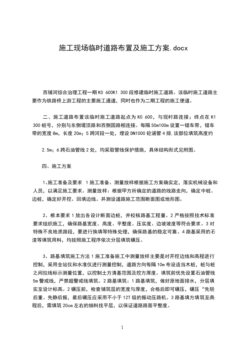 二、施工道路布置该临时施工道路起点为K0 600,与现村路连接;终点在K1 300桩号,分别与东侧堤顶路和西侧园路相连接。每隔50m100m设置一错车带,错车带的宽度8m,长度20m;5跨河段一处,埋设DN1000砼涵管4排,该部位填筑高度约