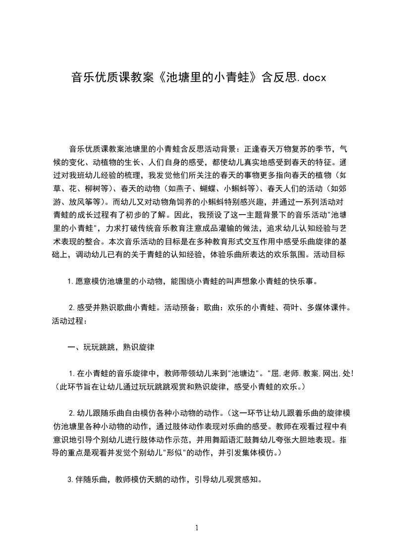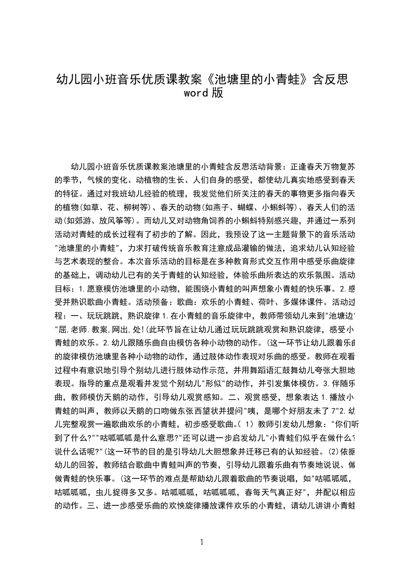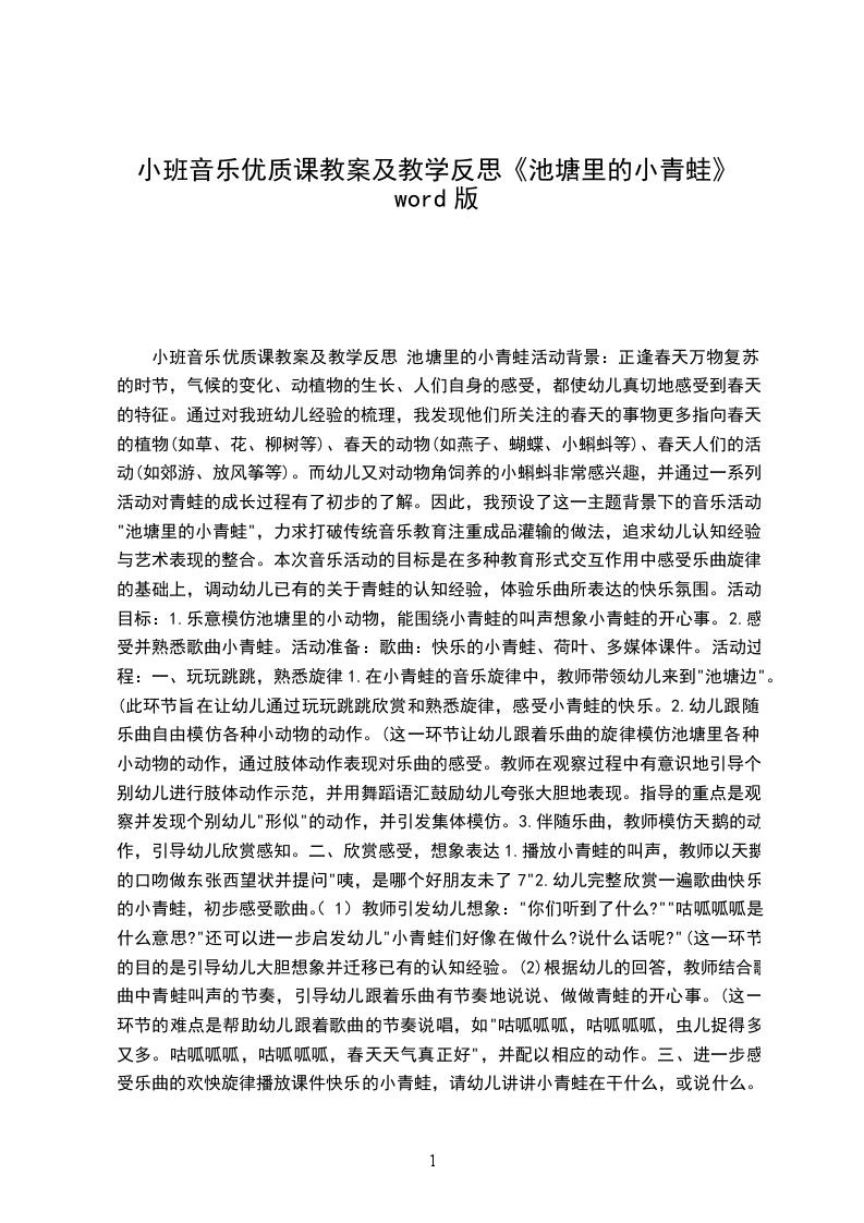 音乐优质课教案池塘里的小青蛙含反思活动背景:正逢春天万物复苏的季节,气候的变化、动植物的生长、人们自身的感受,都使幼儿真实地感受到春天的特征。通过对我班幼儿经验的梳理,我发觉他们所关注的春天的事物更多指向春天的植物(如草、花、柳树等)、春天的动物(如燕子、蝴蝶、小蝌蚪等)、春天人们的活动(如郊游、放风筝等)。而幼儿又对动物角饲养的小蝌蚪特别感兴趣,并通过一系列活动对青蛙的成长过程有了初步的了解。因此,我预设了这一主题背景下的音乐活动"池塘里的小青蛙",力求打破传统音乐教育注意成品灌输的做法,追求幼儿认知经验与艺术表现的整合。本次音乐活动的目标是在多种教育形式交互作用中感受乐曲旋律的基础上,调动幼儿已有的关于青蛙的认知经验,体验乐曲所表达的欢乐氛围。活动目标: