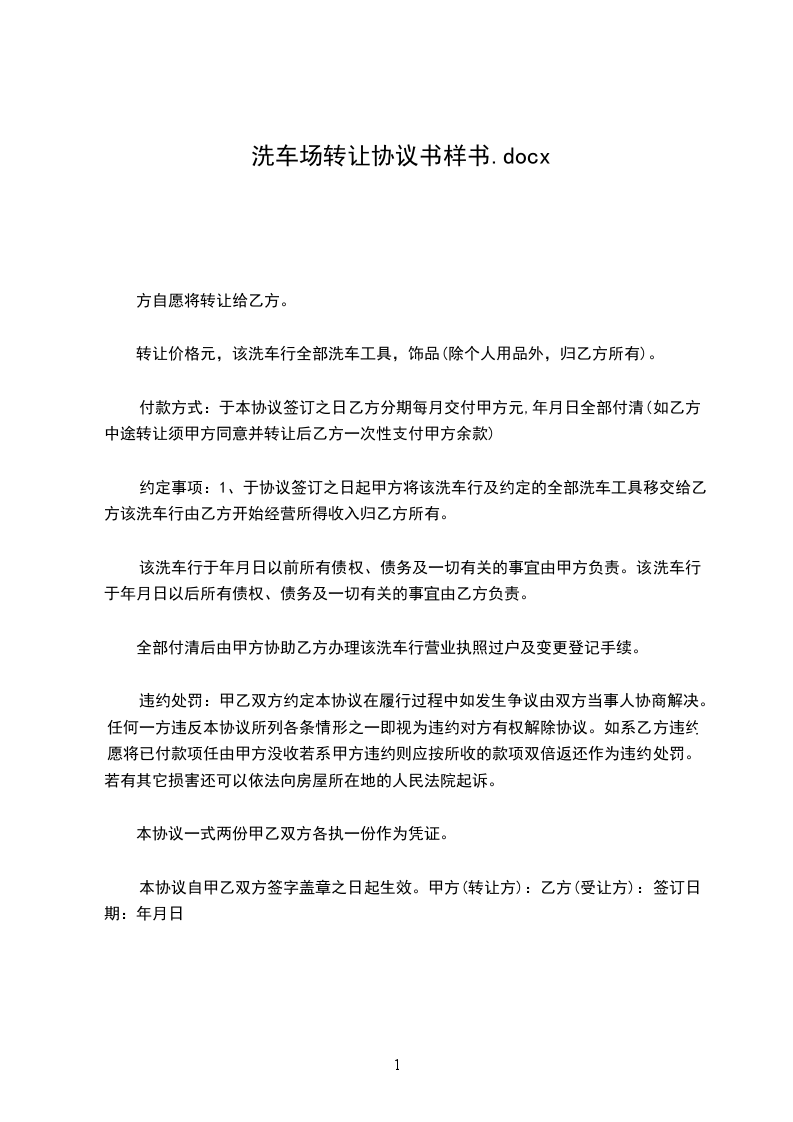 约定事项:1、于协议签订之日起甲方将该洗车行及约定的全部洗车工具移交给乙方该洗车行由乙方开始经营所得收入归乙方所有。