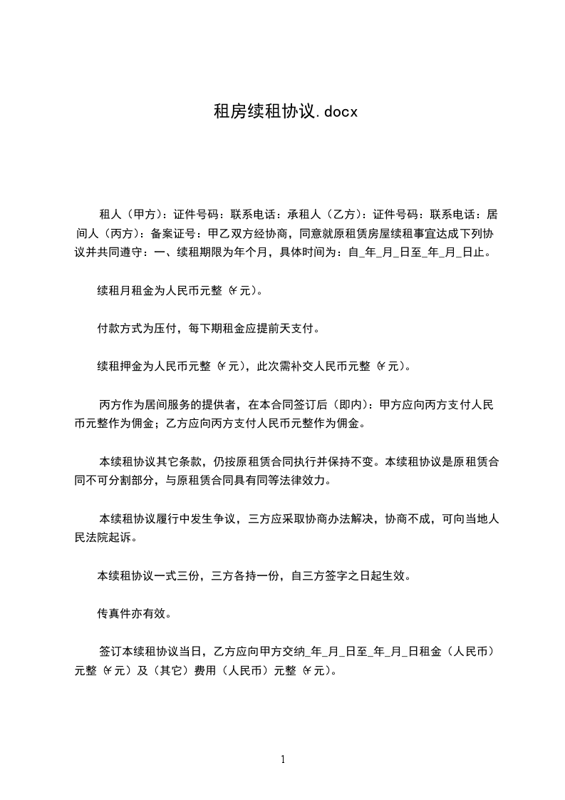 租人(甲方):证件号码:联系电话:承租人(乙方):证件号码:联系电话:居间人(丙方):备案证号:甲乙双方经协商,同意就原租赁房屋续租事宜达成下列协议并共同遵守:一、续租期限为年个月,具体时间为:自_年_月_日至_年_月_日止。