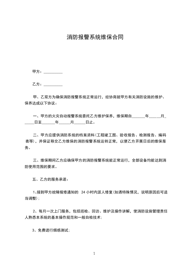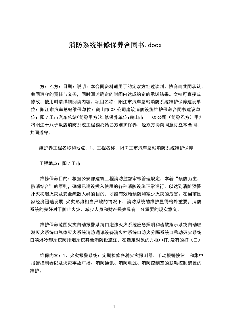 方:乙方:日期:说明:本合同资料适用于约定双方经过谈判、协商而共同承认、共同遵守的责任与义务,同时阐述确定的时间内达成约定的承诺结果。文档可直接或修改,使用时请详细阅读内容。项目名称:阳江市汽车总站消防系统维护保养建设单位:阳江市汽车总站维保单位:鹤山市XX公司建筑消防设施维护保养合同书建设单位:阳7工市汽车总站(简称甲方)维修保养单位:鹤山市XX公司(简称乙方)甲方将阳江十八子饭店消防系统工程委托给乙方维护保养,经双方协商同意订立本合同,共同遵守。