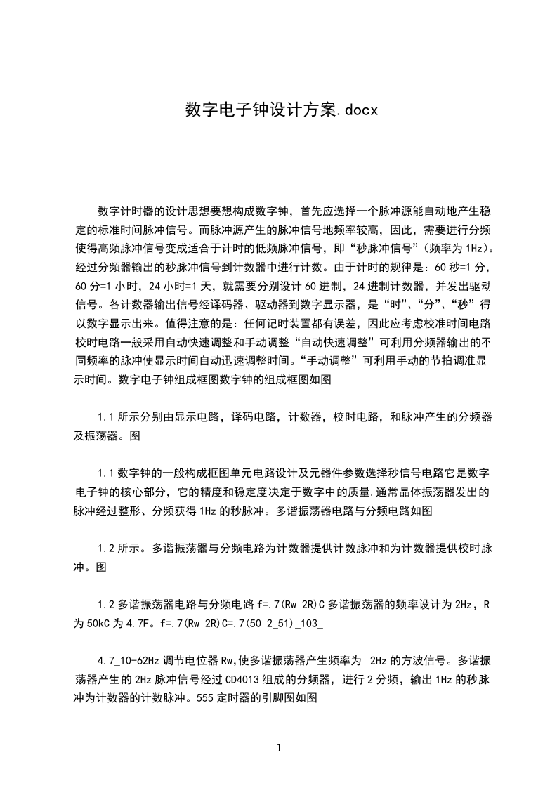 1.1数字钟的一般构成框图单元电路设计及元器件参数选择秒信号电路它是数字电子钟的核心部分,它的精度和稳定度决定于数字中的质量.通常晶体振荡器发出的脉冲经过整形、分频获得1Hz的秒脉冲。多谐振荡器电路与分频电路如图