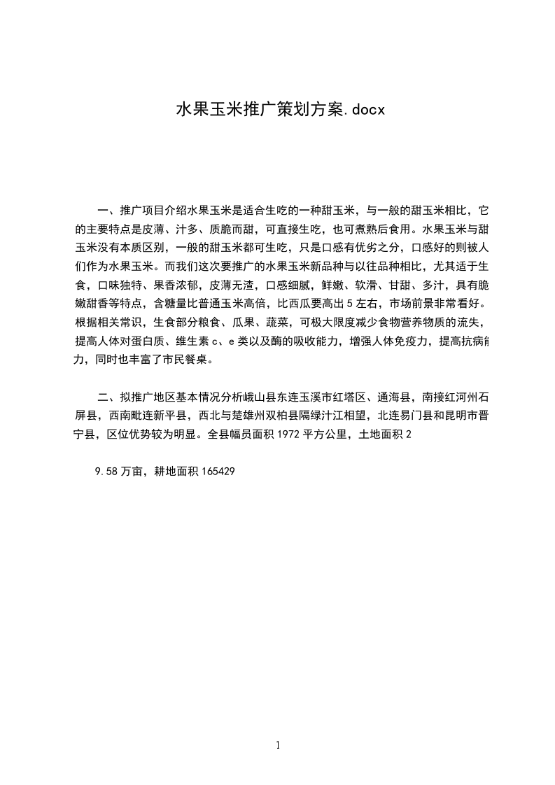 一、推广项目介绍水果玉米是适合生吃的一种甜玉米,与一般的甜玉米相比,它的主要特点是皮薄、汁多、质脆而甜,可直接生吃,也可煮熟后食用。水果玉米与甜玉米没有本质区别,一般的甜玉米都可生吃,只是口感有优劣之分,口感好的则被人们作为水果玉米。而我们这次要推广的水果玉米新品种与以往品种相比,尤其适于生食,口味独特、果香浓郁,皮薄无渣,口感细腻,鲜嫩、软滑、甘甜、多汁,具有脆嫩甜香等特点,含糖量比普通玉米高倍,比西瓜要高出5左右,市场前景非常看好。根据相关常识,生食部分粮食、瓜果、蔬菜,可极大限度减少食物营养物质的流失,提高人体对蛋白质、维生素c、e类以及酶的吸收能力,增强人体免疫力,提高抗病能力,同时也丰富了市民餐桌。