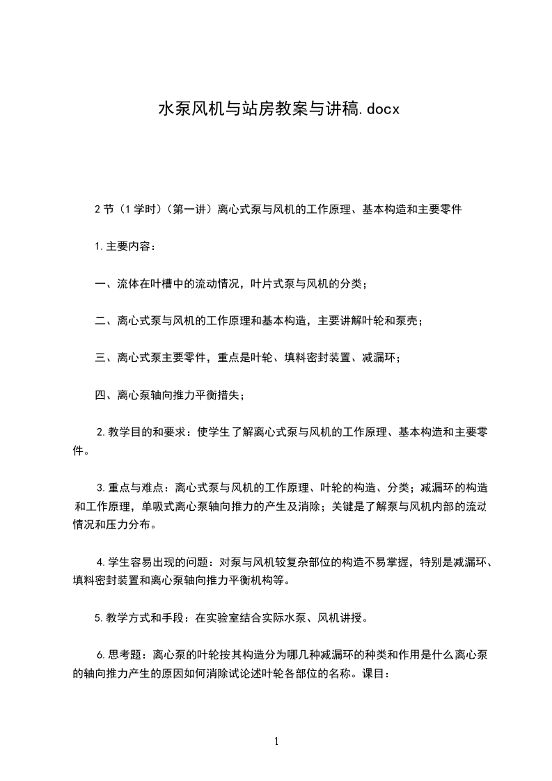 2.教学目的和要求:使学生了解离心式泵与风机的工作原理、基本构造和主要零件。