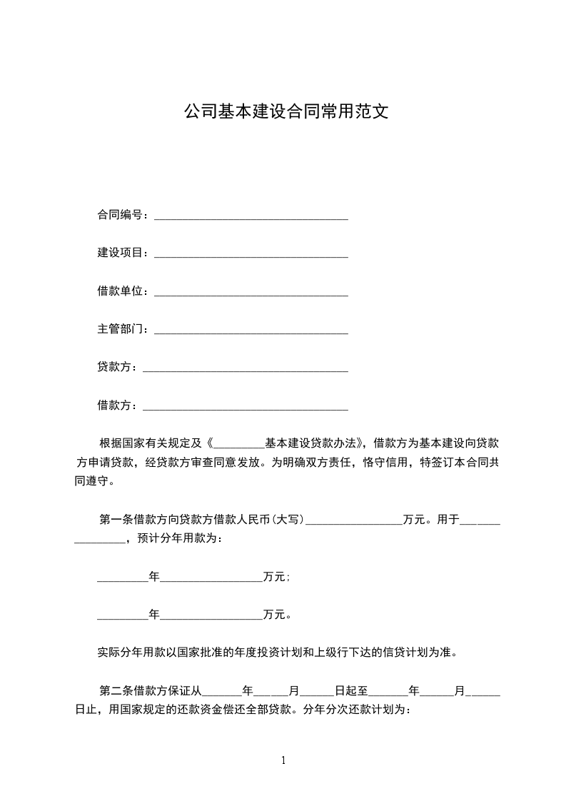 根据国家有关规定及《_________基本建设贷款办法》,借款方为基本建设向贷款方申请贷款,经贷款方审查同意发放。为明确双方责任,恪守信用,特签订本合同共同遵守。