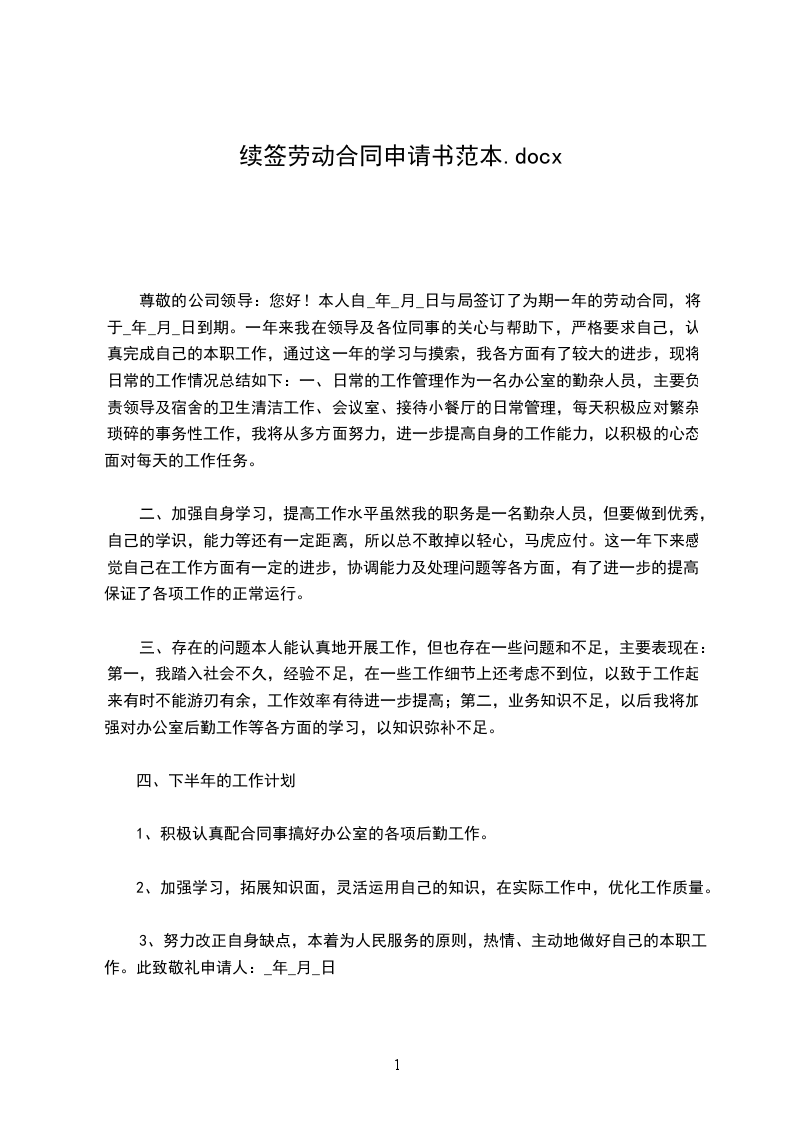 尊敬的公司领导:您好!本人自_年_月_日与局签订了为期一年的劳动合同,将于_年_月_日到期。一年来我在领导及各位同事的关心与帮助下,严格要求自己,认真完成自己的本职工作,通过这一年的学习与摸索,我各方面有了较大的进步,现将日常的工作情况总结如下:一、日常的工作管理作为一名办公室的勤杂人员,主要负责领导及宿舍的卫生清洁工作、会议室、接待小餐厅的日常管理,每天积极应对繁杂琐碎的事务性工作,我将从多方面努力,进一步提高自身的工作能力,以积极的心态面对每天的工作任务。