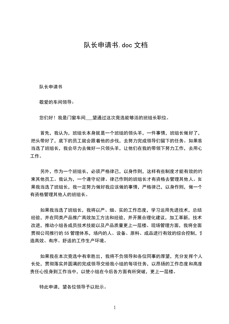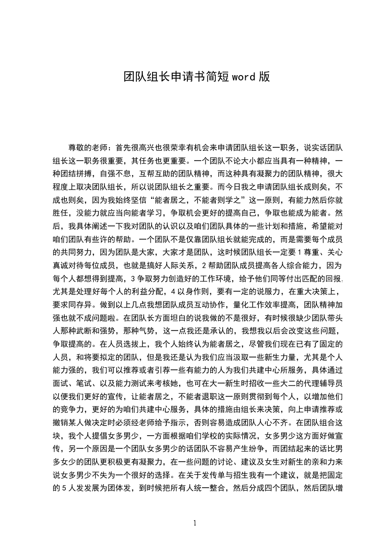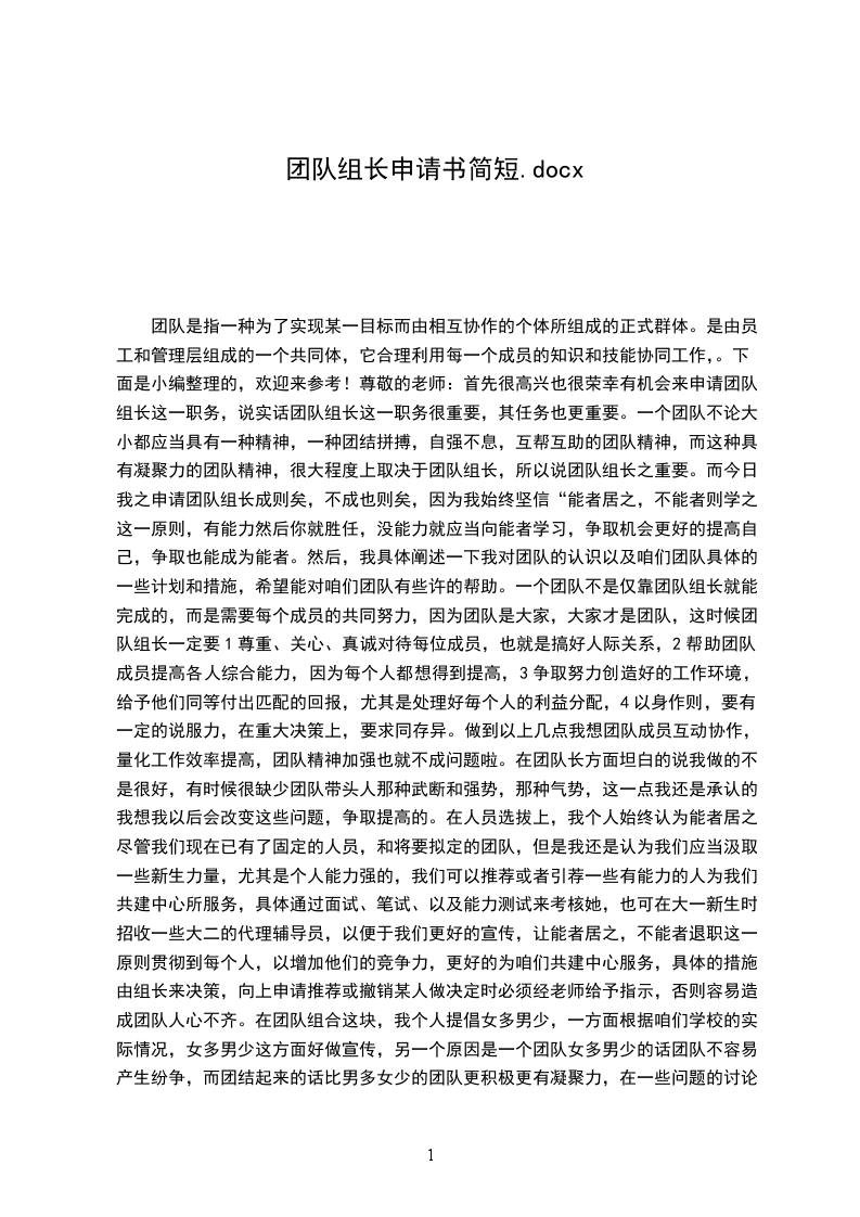 申请书尊敬的老师:首先很高兴也很荣幸有机会来申请团队组长这一职务,说实话团队组长这一职务很重要,其任务也更重要。一个团队不论大小都应当具有一种精神,一种团结拼搏,自强不息,互帮互助的团队精神,而这种具有凝聚力的团队精神,很大程度上取决于团队组长,所以说团队组长之重要。而今日我之申请团队组长成则矣,不成也则矣,因为我始终坚信能者居之,不能者则学之这一原则,有能力然后你就胜任,没能力就应当向能者学习,争取机会更好的提高自己,争取也能成为能者。然后,我具体阐述一下我对团队的认识以及咱们团队具体的一些计划和措施,希望能对咱们团队有些许的帮助。一个团队不是仅靠团队组长就能完成的,而是需要每个成员的共同努力,因为团队是大家,大家才是团队,这时候团队组长一定要1尊重、关心、真诚对待每位成员,也就是搞好人际关系,2帮助团队成员提高各人综合能力,因为每个人都想得到提高,3争取努力创造好的工作环境,给予他们同等付出匹配的回报,尤其是处理好毎个人的利益分配,4以身作则,要有一定的说服力,在重大决策上,要求同存异。做到以上几点我想团队成员互动协作,量化工作效率提高,团队精神加强也就不成问题啦。在团队长方面坦白的说我做的不是很好,有时候很缺少团队带头人那种武断和强势,那种气势,这一点我还是承认的,我想我以后会改变这些问题,争取提高的。在人员选拔上,我个人始终认为能者居之,尽管我们现在已有了固定的人员,和将要拟定的团队,但是我还是认为我们应当汲取一些新生力量,尤其是个人能力强的,我们可以推荐或者引荐一些有能力的人为我们共建中心所服务,具体通过面试、笔试、以及能力测试来考核她,也可在大一新生时招收一些大二的代理辅导员,以便于我们更好的宣传,让能者居之,不能者退职这一原则贯彻到每个人,以增加他们的竞争力,更好的为咱们共建中心服务,具体的措施由组长来决策,向上申请推荐或撤销某人做决定时必须经老师给予指示,否则容易造成团队人心不齐。在团队组合这块,我个人提倡女多男少,一方面根据咱们学校的实际情况,女多男少这方面好做宣传,另一个原因是一个团队女多男少的话团队不容易产生纷争,而团结起来的话比男多女少的团队更积极更有凝聚力,在一些问题的讨论、建议及女生对新生的亲和力来说女多男少不失为一个很好的选择。在关于发传单与招生我有一个建议,就是把固定的5人发发展为团体发,到时候把所有人统一整合,然后分成四个团队,然后团队增加一个任务就是发传单,这相比5人来说有诸多好处,