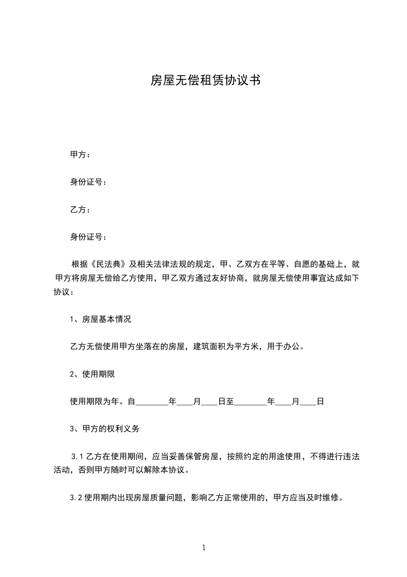 乙方无偿使用甲方坐落在的房屋,建筑面积为_____平方米,用于办公。