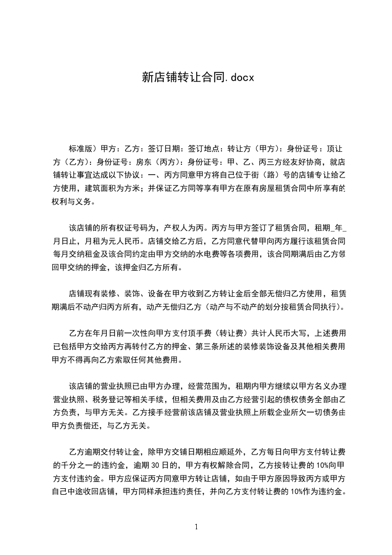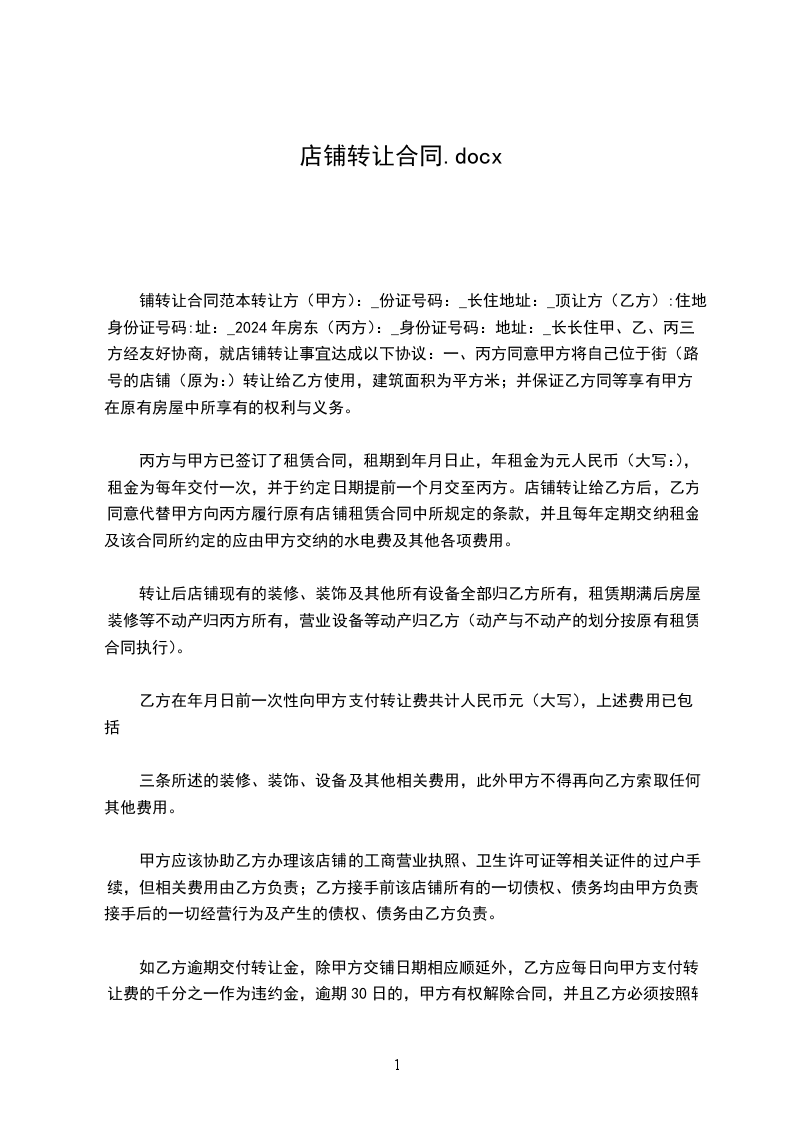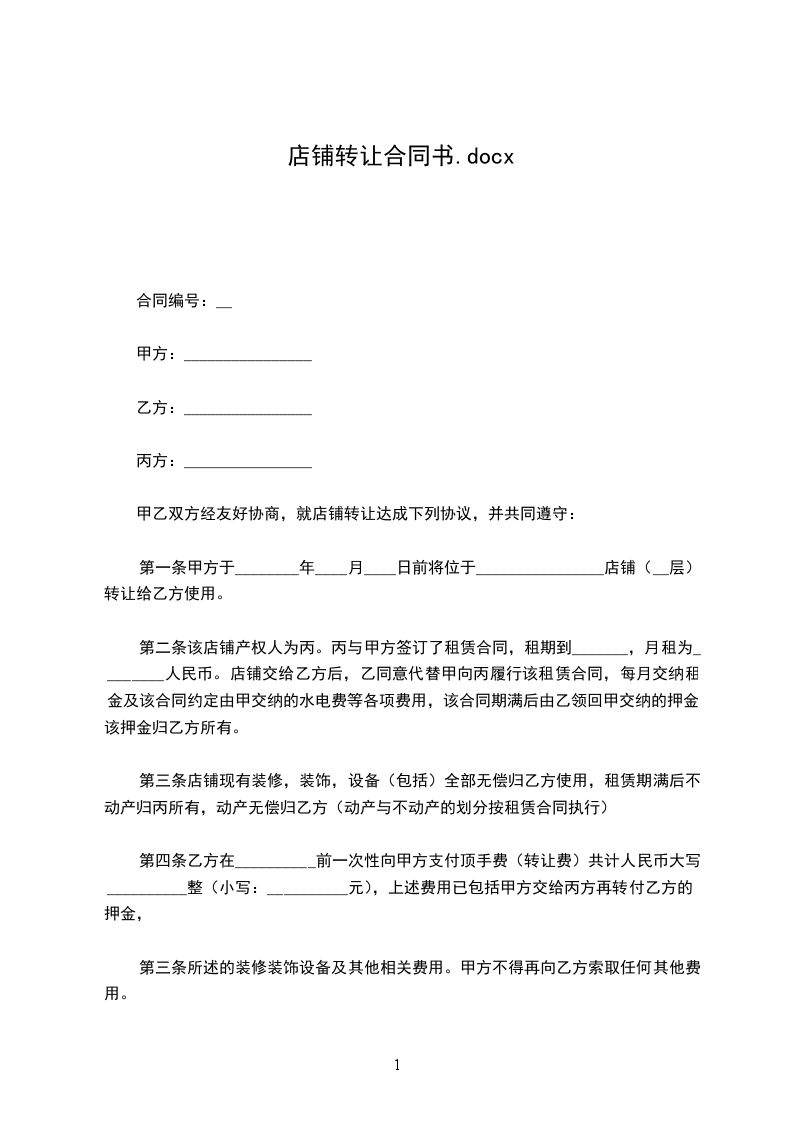 让方甲方:身份证号:顶让方乙方:身份证号:房东丙方:身份证号:甲、乙、丙三方经友好协商,就店铺转让事宜达成以下协议:一、丙方同意甲方将自己位于街路号的店铺(原为:)转让给乙方使用,建筑面积为平方米;并确保乙方同等享有甲方在原有房屋租赁合同中所享有的权利与义务。